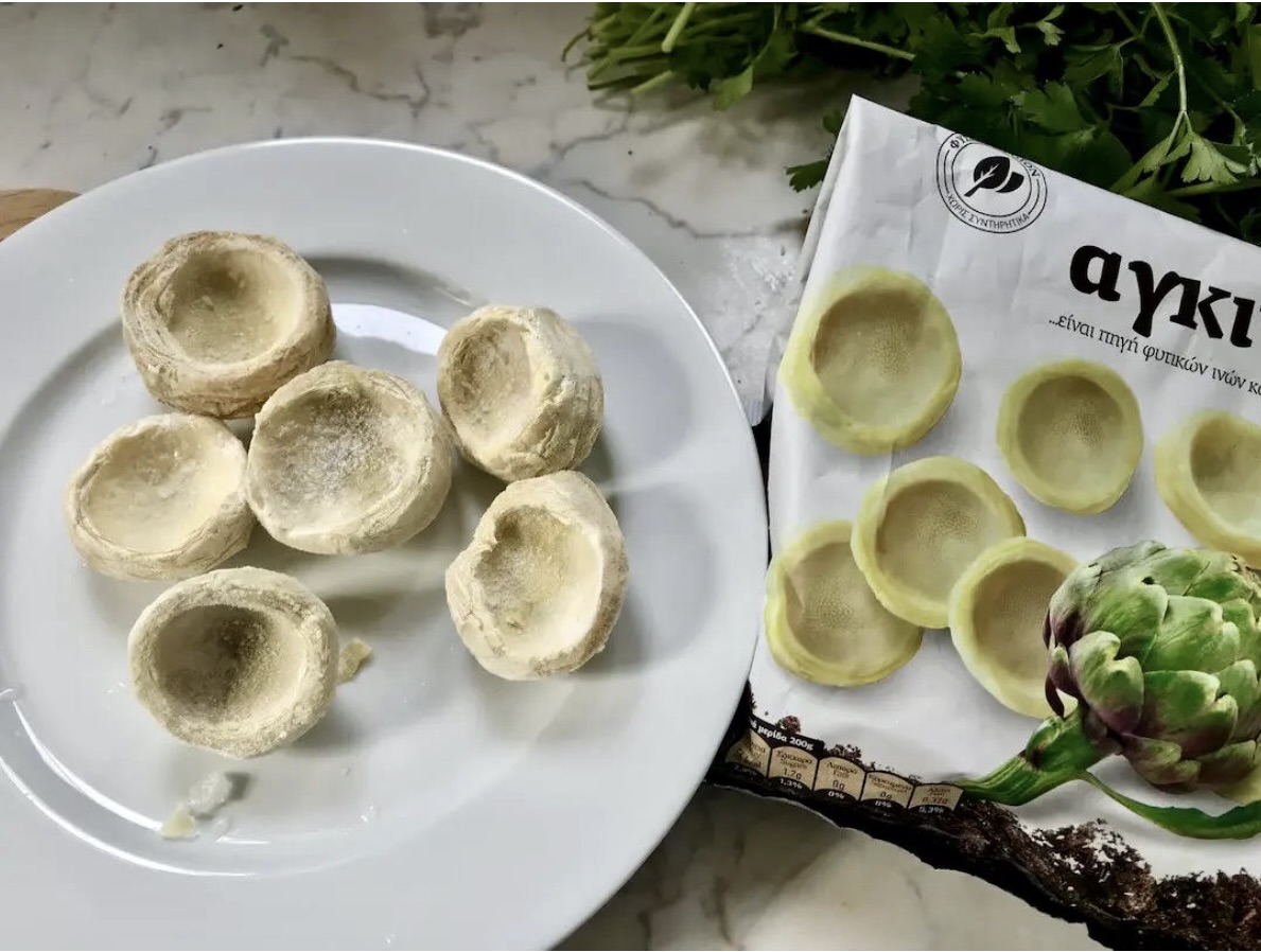 Warzywa: kilka serc karczochów (mogą być mrożone), duża garść zielonego groszku, duża czerwona cebula