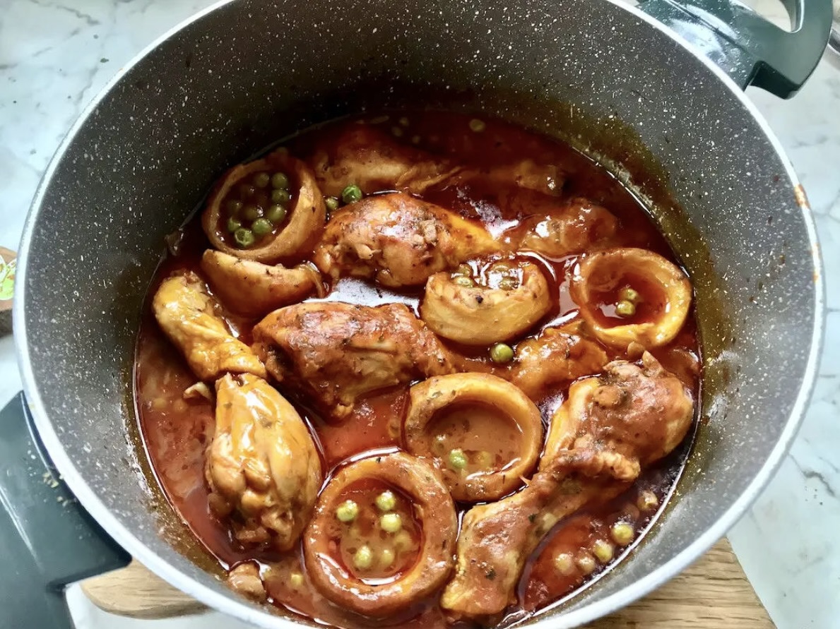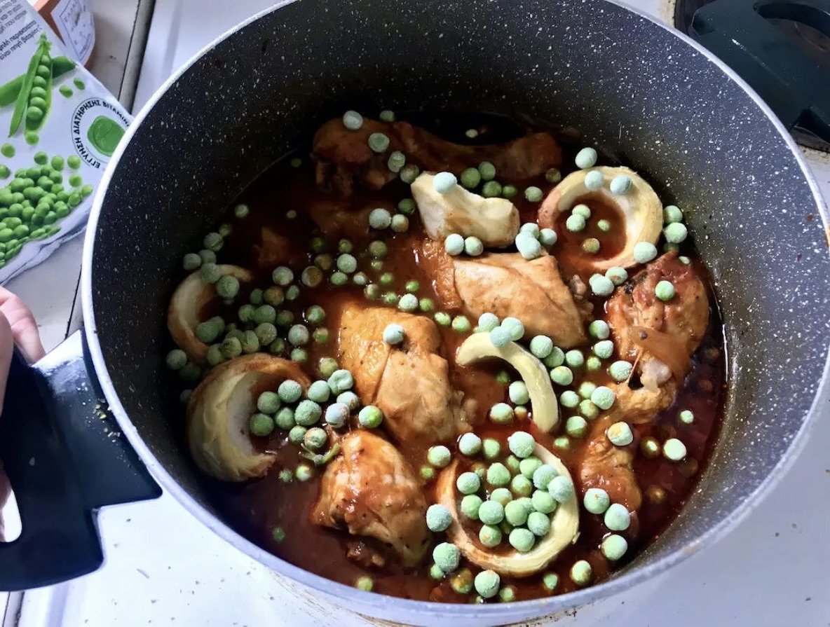 Dodatki: Po tym czasie do garnka dodaj serca karczochów oraz mrożony groszek. Całość zagotuj, a następnie duś pod przykryciem na minimalnym ogniu przez kolejne 10–15 minut.