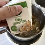 Na patelni z oliwą zeszklona cebulę. Dodaj fasolkę i marchewkę. Smaż przez 2–3 minuty na średnim ogniu (uważaj, by nie przypalić). Na koniec dorzuć czosnek, a następnie smaż jeszcze przez minutę.