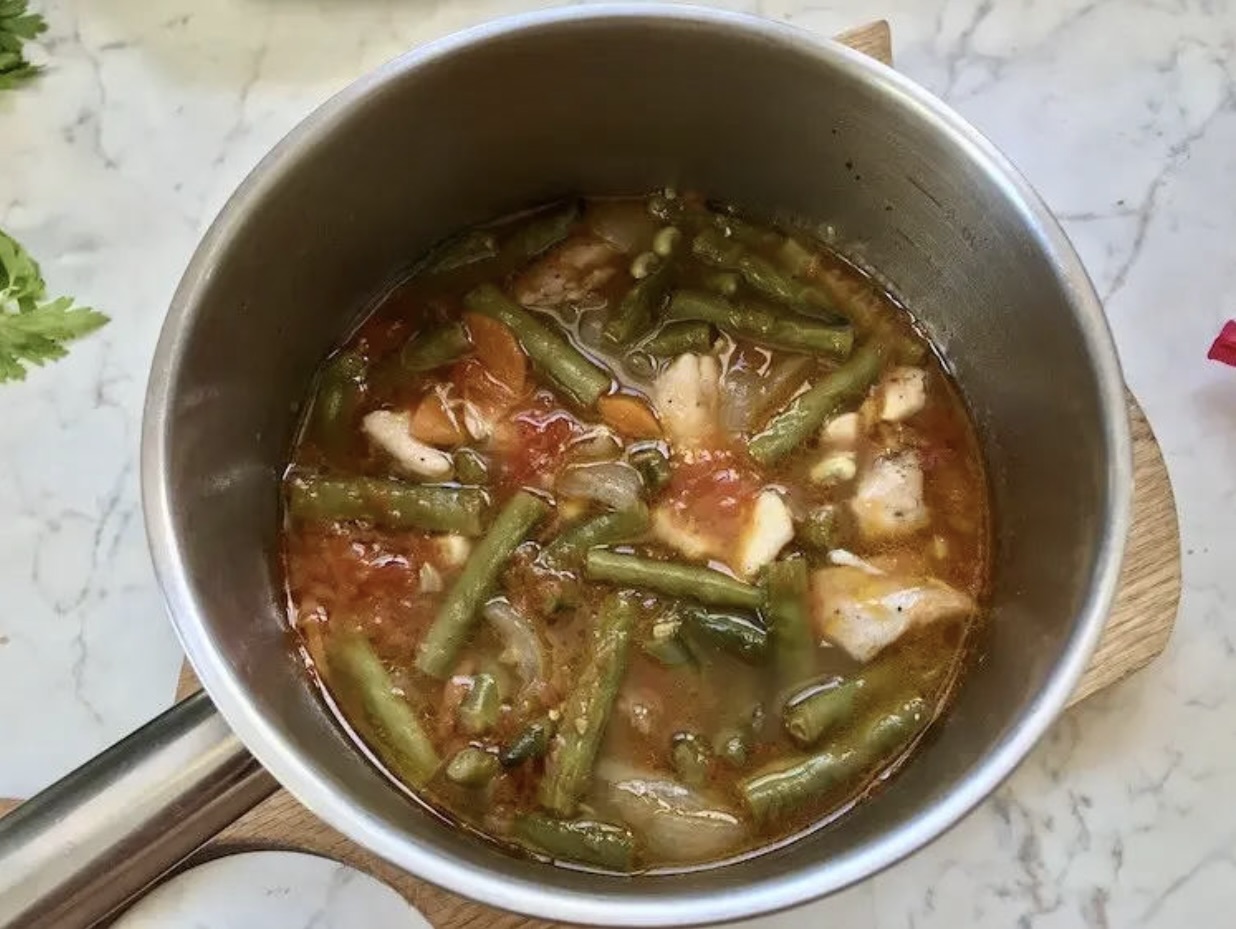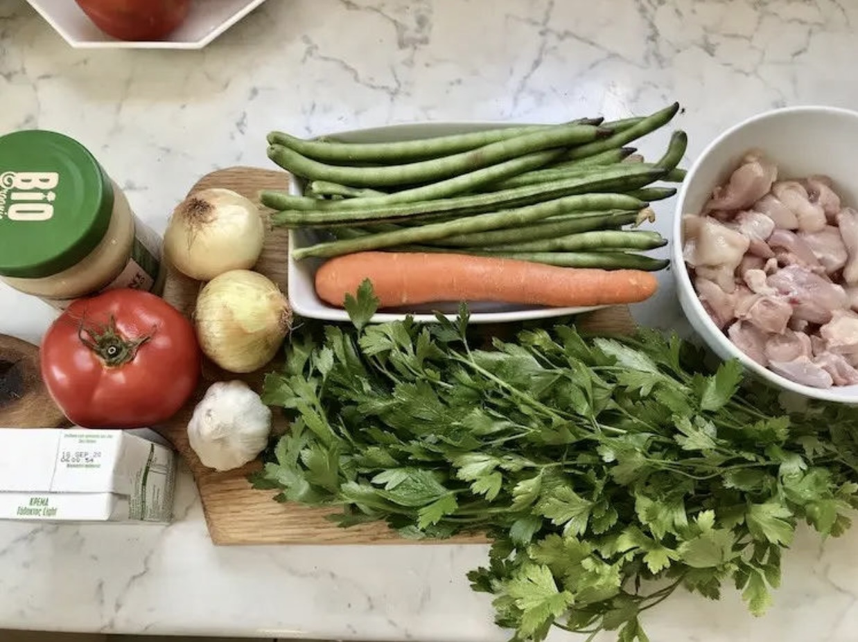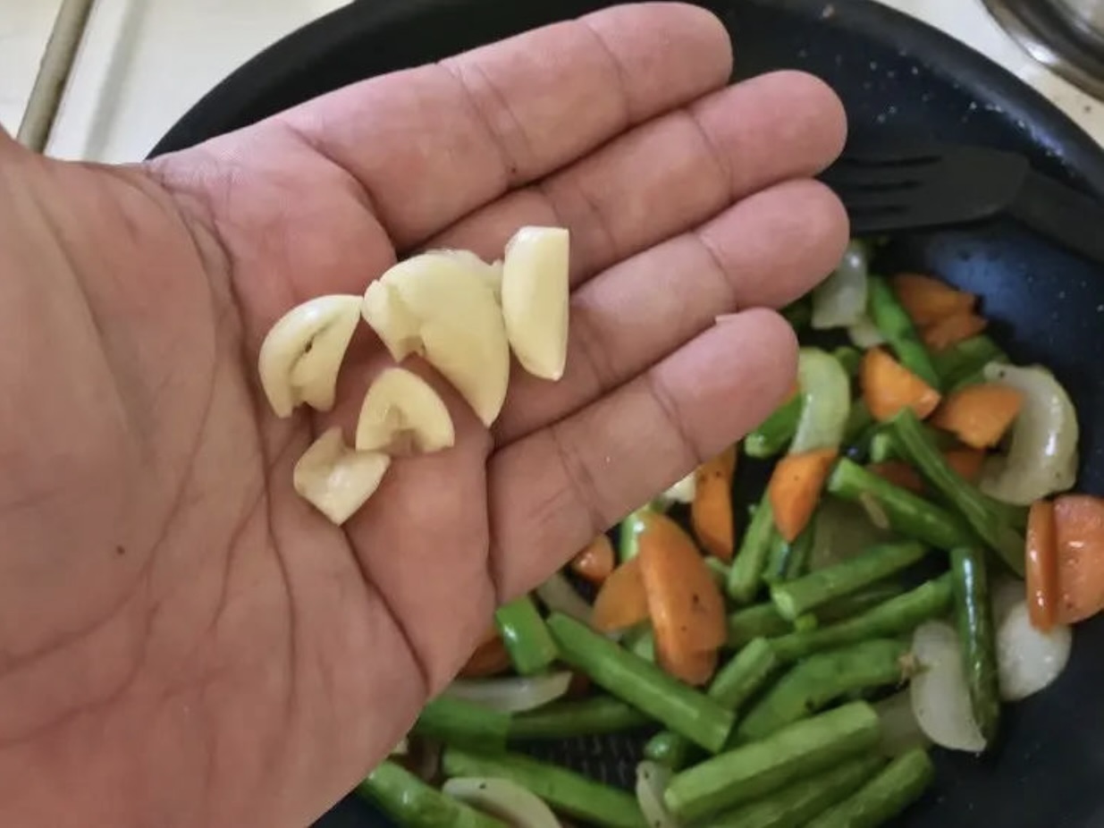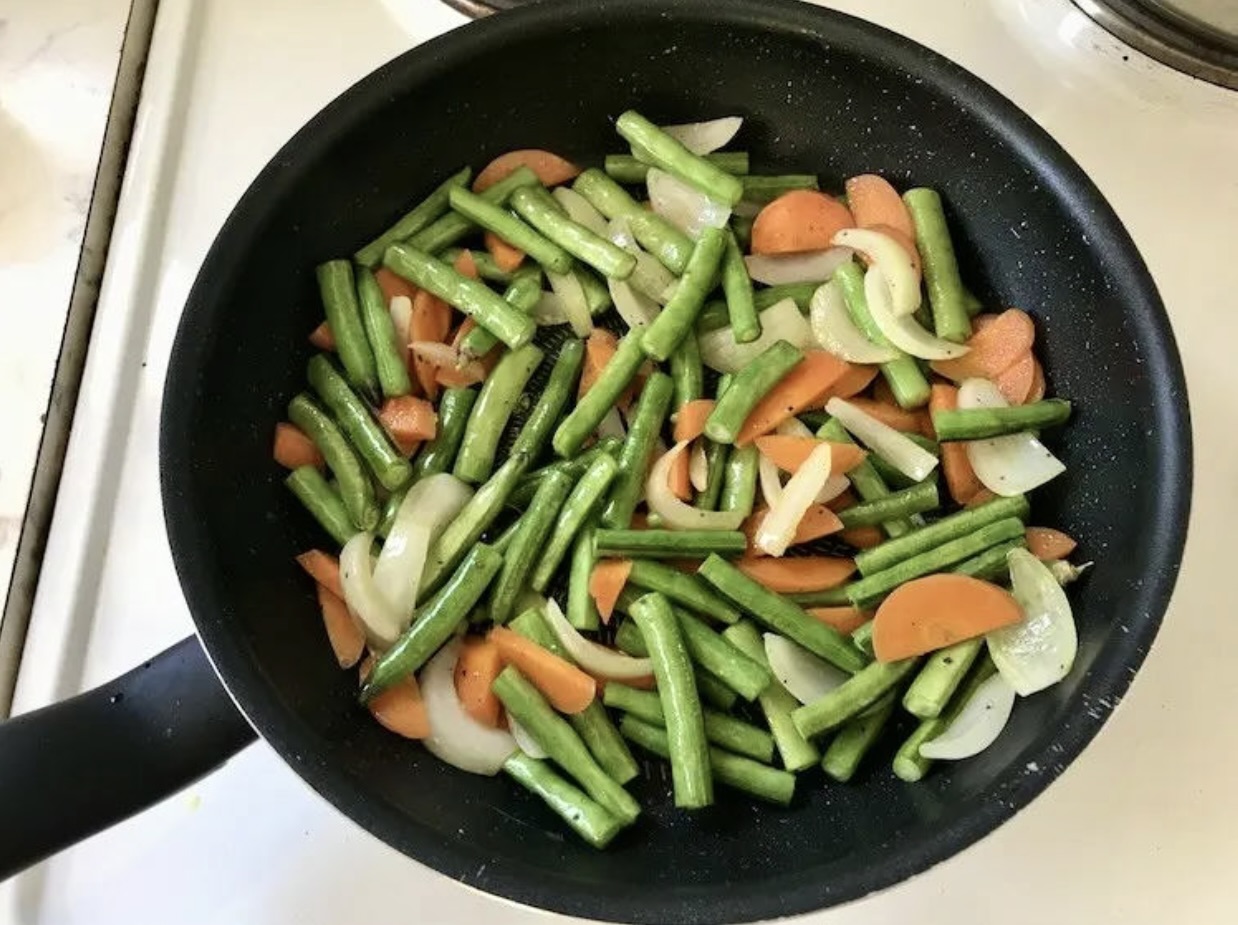 Na patelni z oliwą zeszklona cebulę. Dodaj fasolkę i marchewkę. Smaż przez 2–3 minuty na średnim ogniu (uważaj, by nie przypalić). Na koniec dorzuć czosnek, a następnie smaż jeszcze przez minutę.