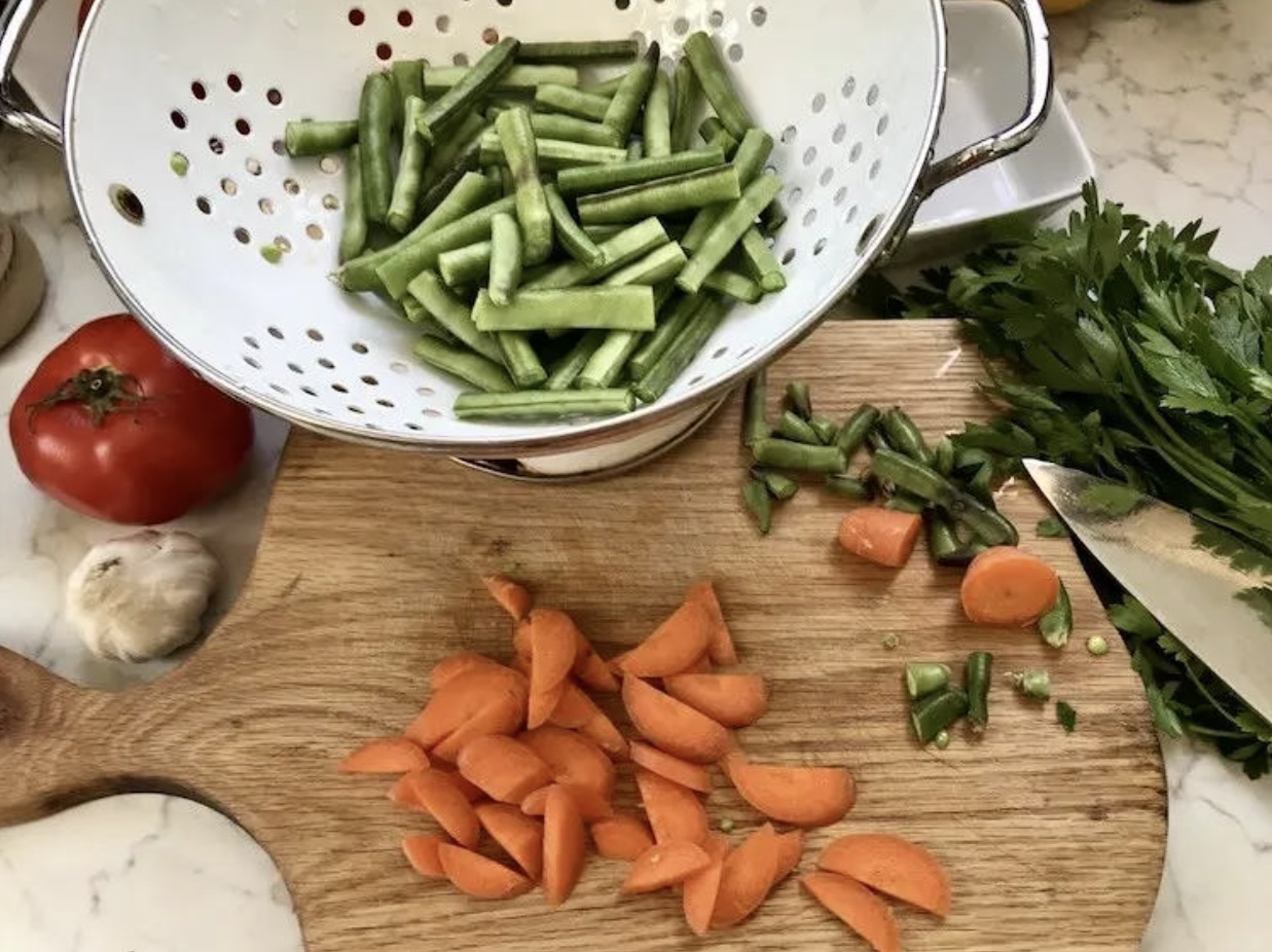 Z fasolki odkrawamy końcówki, a następnie kroimy ją na mniejsze kawałki.