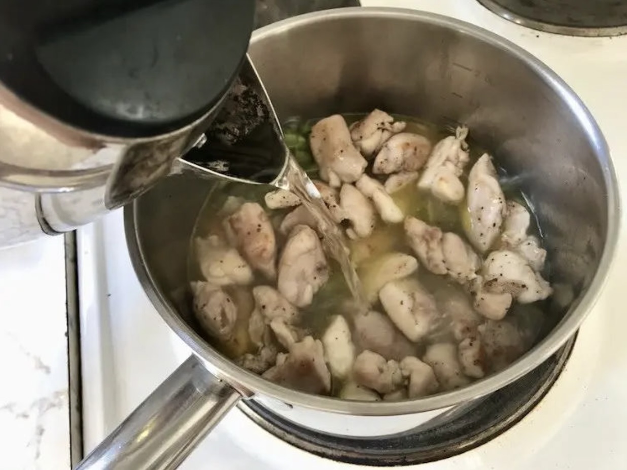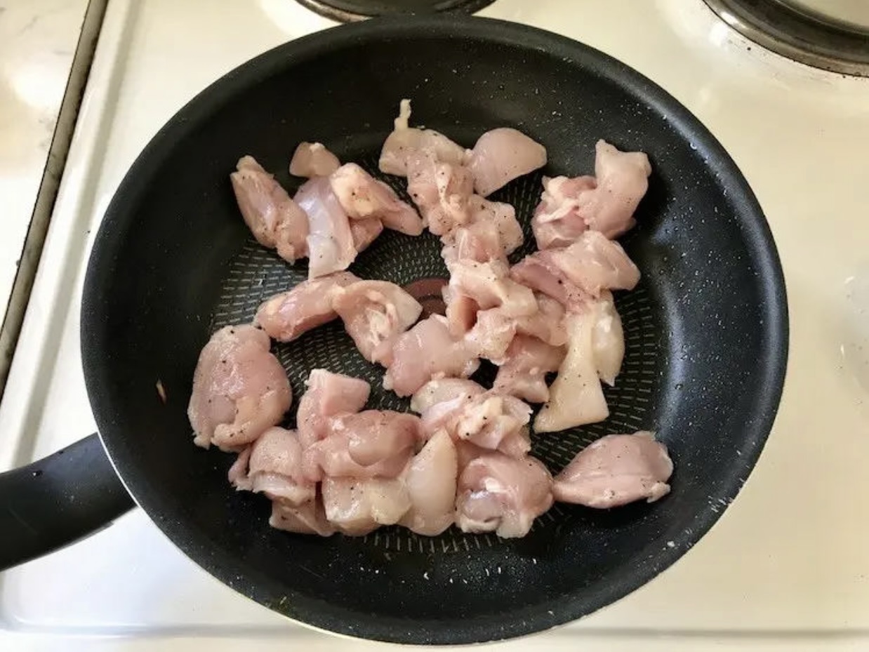 W tym czasie na patelni (na mocnym ogniu) podsmaż posolone kawałki kurczaka przez około 2–3 minuty, często mieszając.