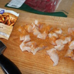 Mięso pokrój w niedużą kostkę i przypraw ulubioną przyprawą. Jeśli mieszanka przypraw zawiera już sól, nie sol dodatkowo mięsa.