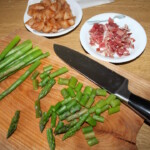 Obróbka szparagów: Szparagi odcedź i przelej zimną wodą, aby zachowały piękny, zielony kolor. Odłóż je na ręczniki papierowe. Pokrój szparagi na małe kawałki (według upodobania), a szynkę szwarcwaldzką w drobną kosteczkę.
