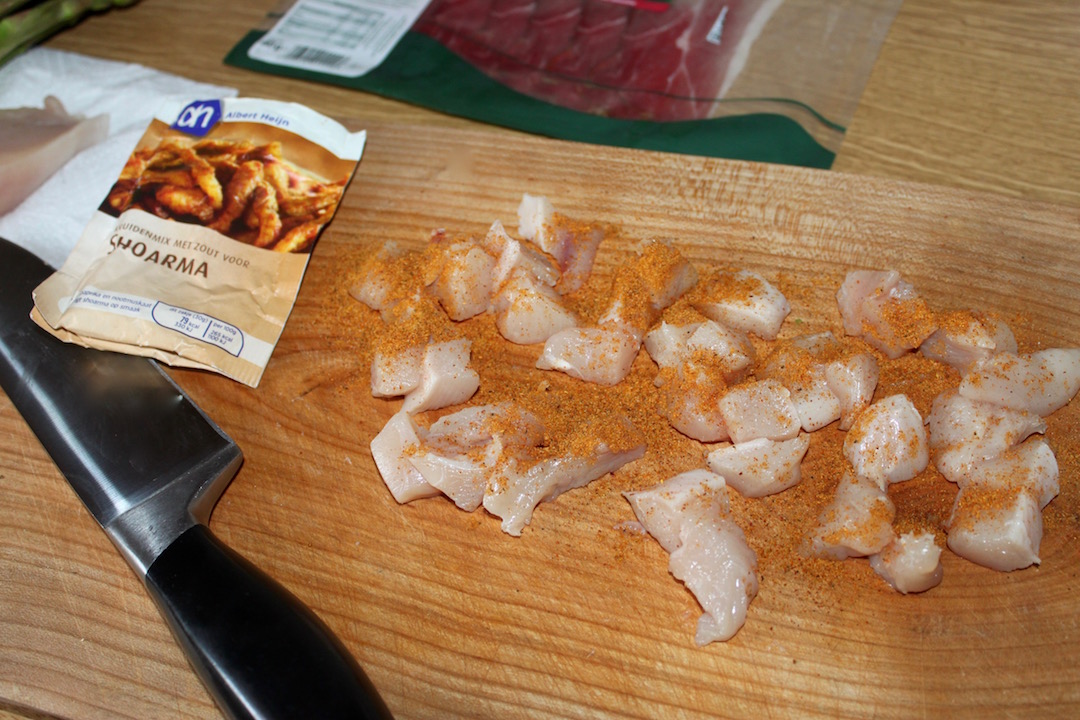 Mięso pokrój w niedużą kostkę i przypraw ulubioną przyprawą. Jeśli mieszanka przypraw zawiera już sól, nie sol dodatkowo mięsa.