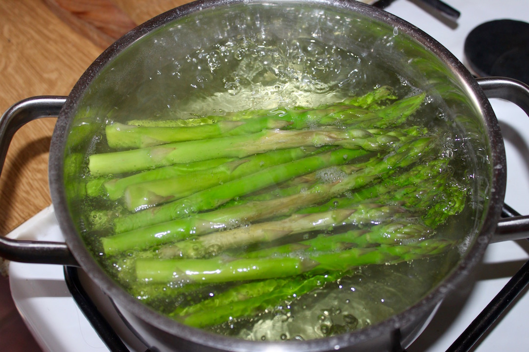 Blanszowanie szparagów (opcjonalnie): Szparagi wrzuć na wrzącą, lekko osoloną wodę i gotuj 3 minuty od momentu ponownego zagotowania wody. (Jeśli wolisz surowe szparagi, możesz pominąć ten krok).
