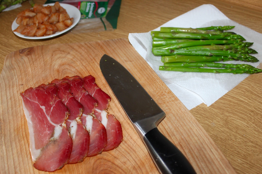 Obróbka szparagów: Szparagi odcedź i przelej zimną wodą, aby zachowały piękny, zielony kolor. Odłóż je na ręczniki papierowe. Pokrój szparagi na małe kawałki (według upodobania), a szynkę szwarcwaldzką w drobną kosteczkę.