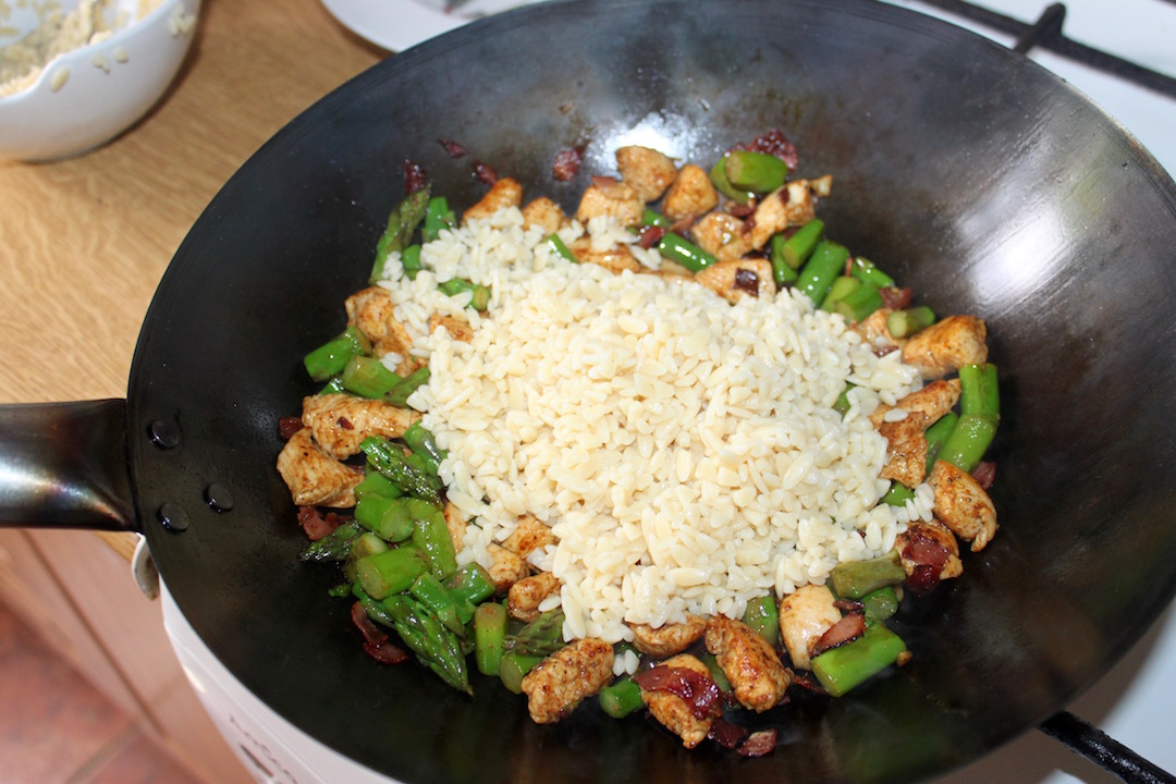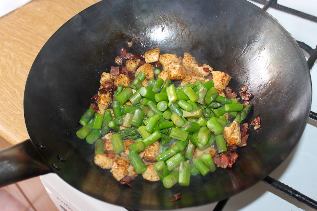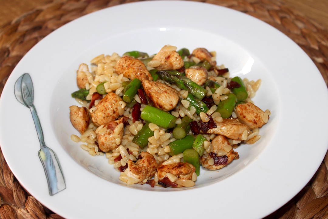 Szybkie i proste danie z krótko smażonym na woku kurczakiem, kruchymi zielonymi szparagami, szynką szwarcwaldzką i makaronem orzo.