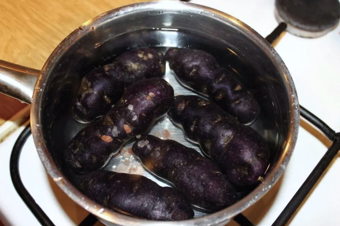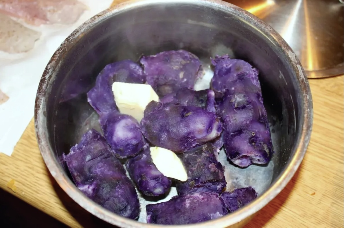 Ziemniaki: Wyszoruj fioletowe ziemniaki i gotuj je w osolonej wodzie do miękkości (ok. 25 minut). Po ugotowaniu obierz, dodaj łyżkę masła i ugnieć na puree. Trzymaj pod przykryciem w cieple.