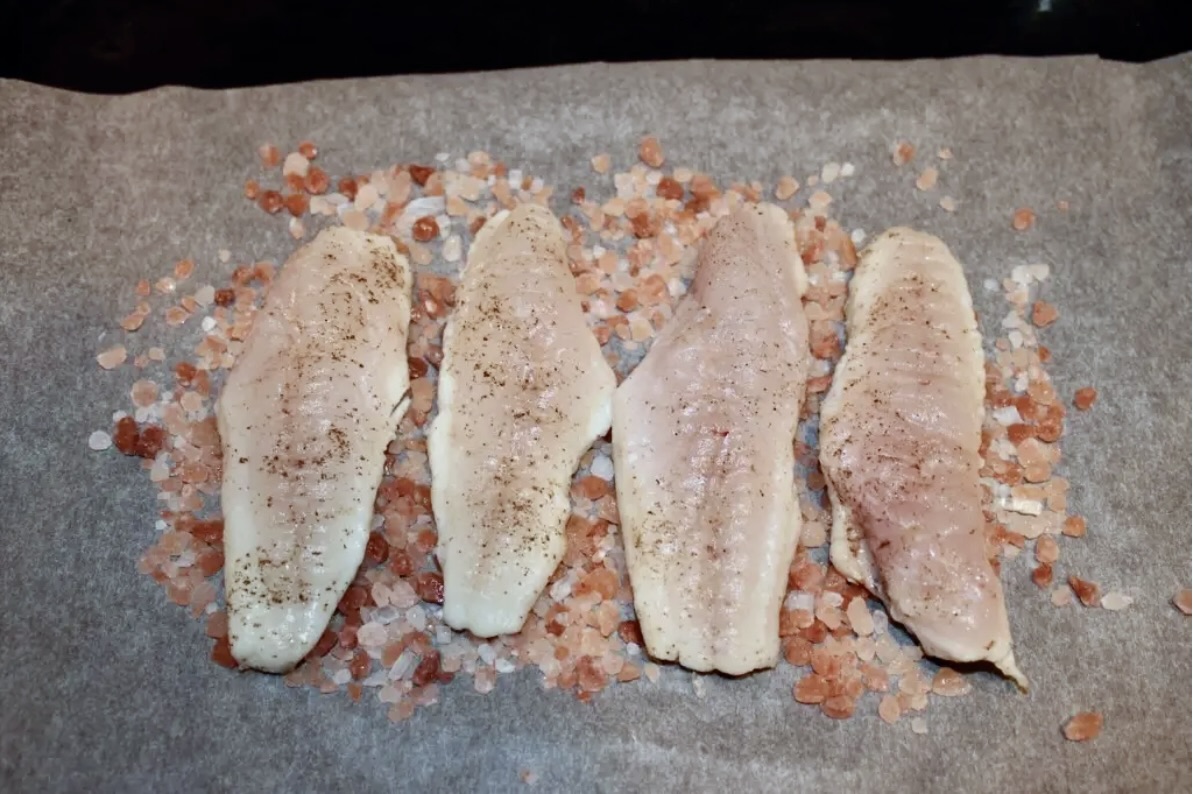 Przełóż filety na blachę wysypaną solą gruboziarnistą (skórą do dołu).
