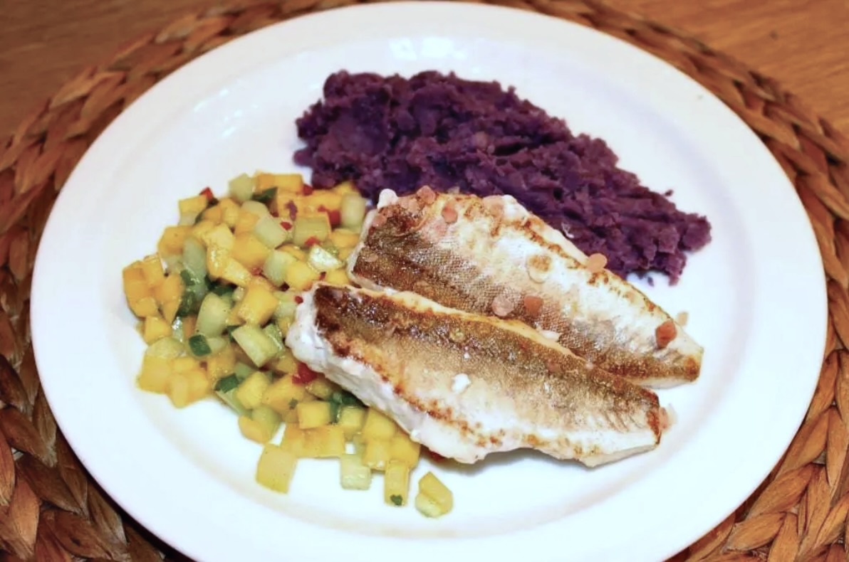 Podanie: Na talerz wyłóż puree ziemniaczane, dodaj salsę z mango (salsa z mango przepis), a na wierzchu niech wyląduje ryba. Podawaj od razu.