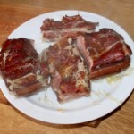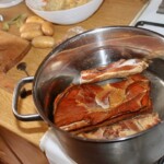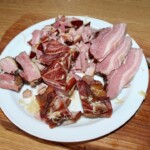 Wyjęcie i krojenie mięsa: Gdy wędzonki są miękkie, wyjmij je z garnka i pozostaw do przestygnięcia.
