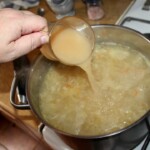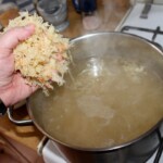 Dodanie kapusty i soku: Posiekaj kapustę kiszoną i po upływie 30 minut włóż ją do garnka. Wlej również sok z kiszonej kapusty (musi być naprawdę kwaśno).