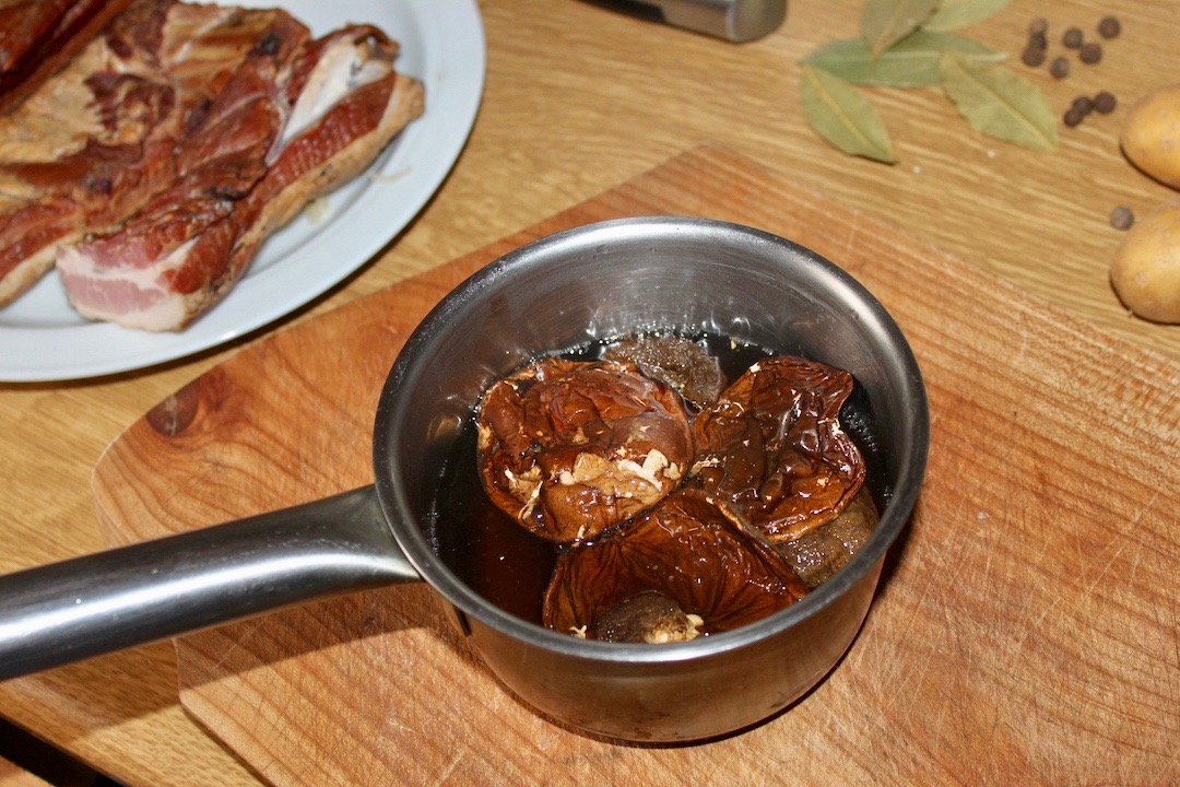 Przygotowanie grzybów: Do małego garnka włóż suszone grzyby i zalej je szklanką gorącej wody. Pozostaw do namaczania.