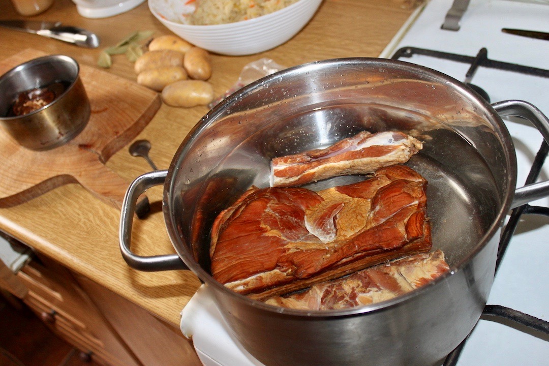 Gotowanie wędzonek: Boczek i żeberka (po dokładnym opłukaniu pod bieżącą wodą) włóż do dużego garnka i zalej je 3 litrami zimnej wody. Doprowadź do wrzenia, usuń szumowiny, zmniejsz ogień i gotuj 30 minut na bardzo wolnym ogniu pod przykryciem (wędzonki powinny się parzyć, a nie gotować).