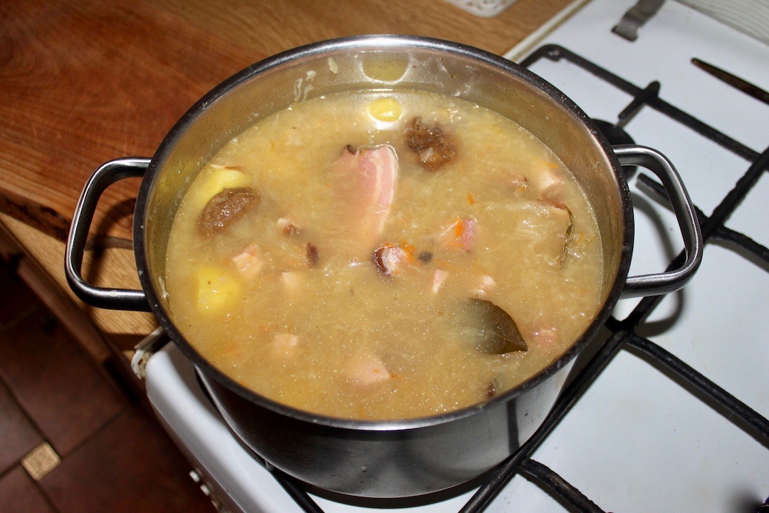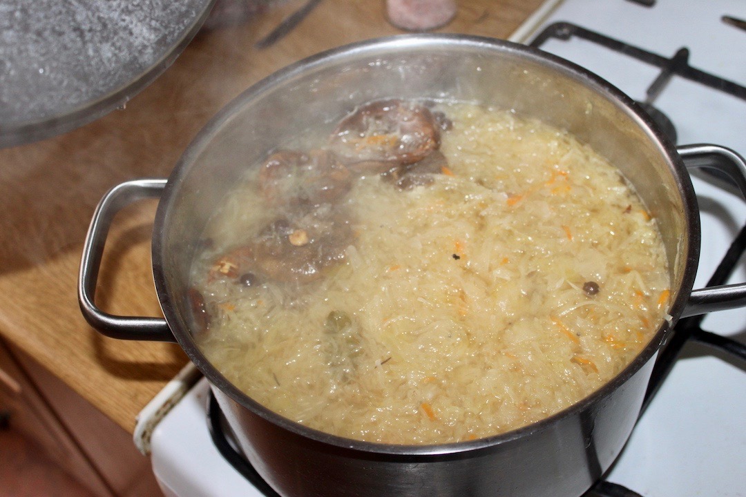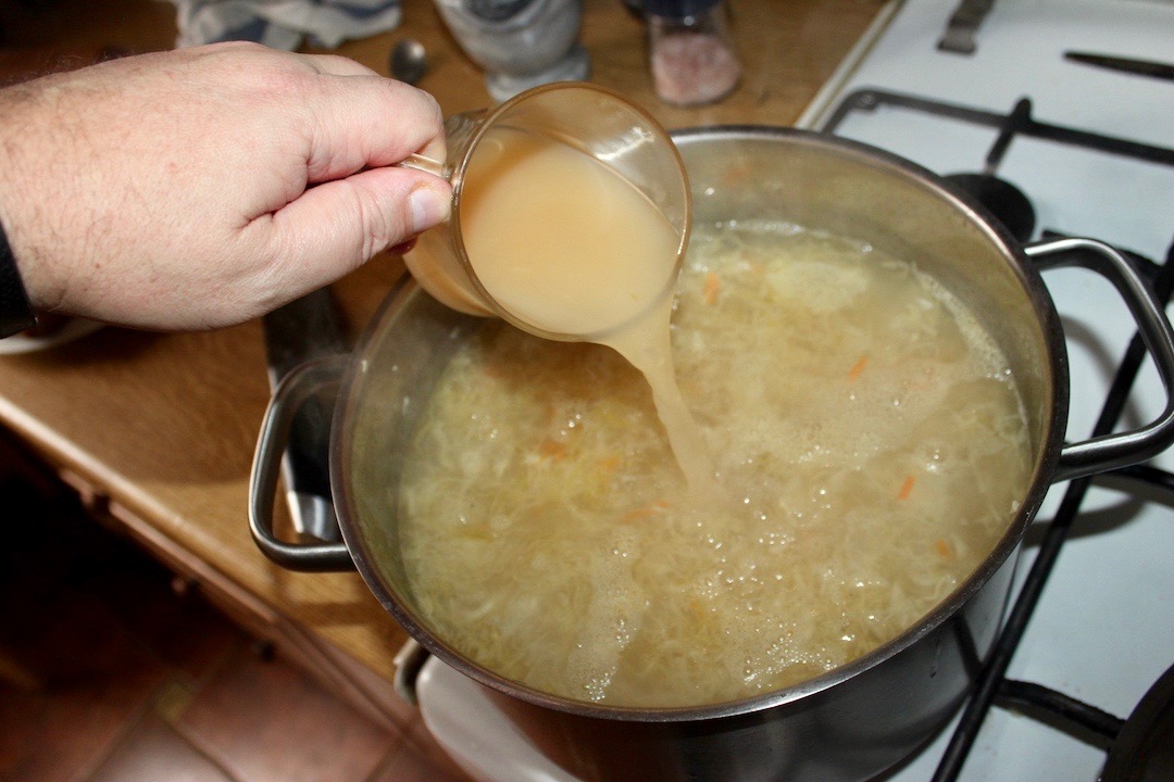 Dodanie kapusty i soku: Posiekaj kapustę kiszoną i po upływie 30 minut włóż ją do garnka. Wlej również sok z kiszonej kapusty (musi być naprawdę kwaśno).