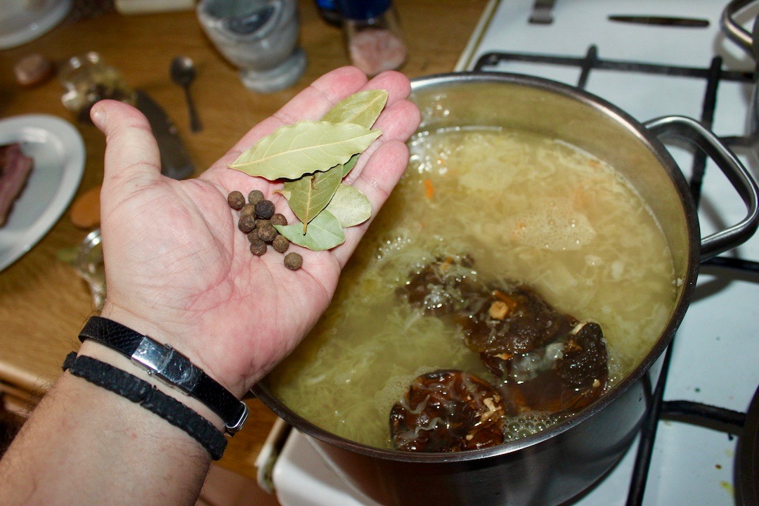 Dodanie reszty przypraw: Do garnka wlej namoczone grzyby wraz z wodą, w której się moczyły. Dodaj liście laurowe, ziele angielskie, a także łyżeczkę zmiażdżonego w moździerzu pieprzu. Następnie gotuj na wolnym ogniu.