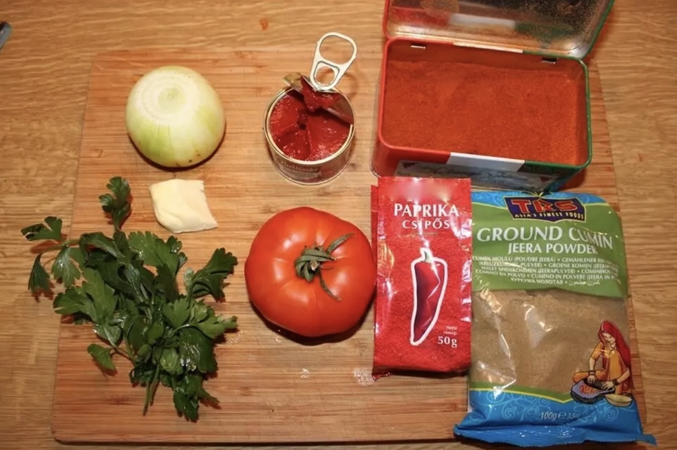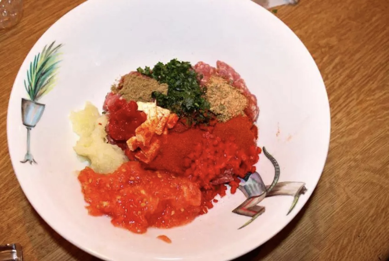 Mięso zmiel. Zetrzyj do niego cebulę, dodaj wszystkie przyprawy (kmin, obie papryki, sól, pieprz, masło, koncentrat pomidorowy) wraz ze startym pomidorem.
