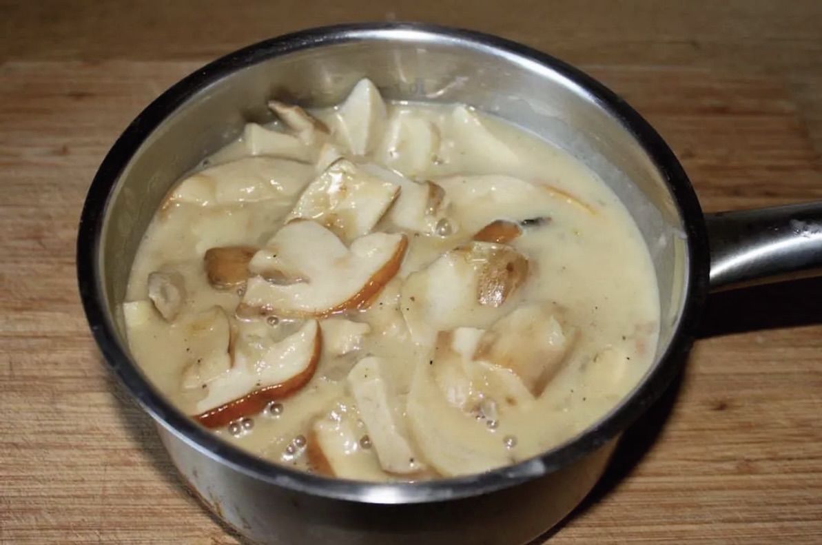 Przygotowanie grzybów: Grzyby dokładnie oczyść, a następnie pokrój w kostkę lub plasterki. Na patelni rozgrzej masło z odrobiną oliwy, wrzuć grzyby i smaż na dużym ogniu, aż odparuje woda i lekko się zrumienią. Zdejmij z patelni (przygotuj sos grzybowy ze świeżych prawdziwków).