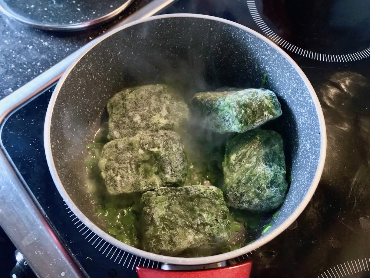 Warzywa: 300 g mrożonego szpinaku (lub ok. 500 g świeżego), dymka, 1-2 ząbki czosnku