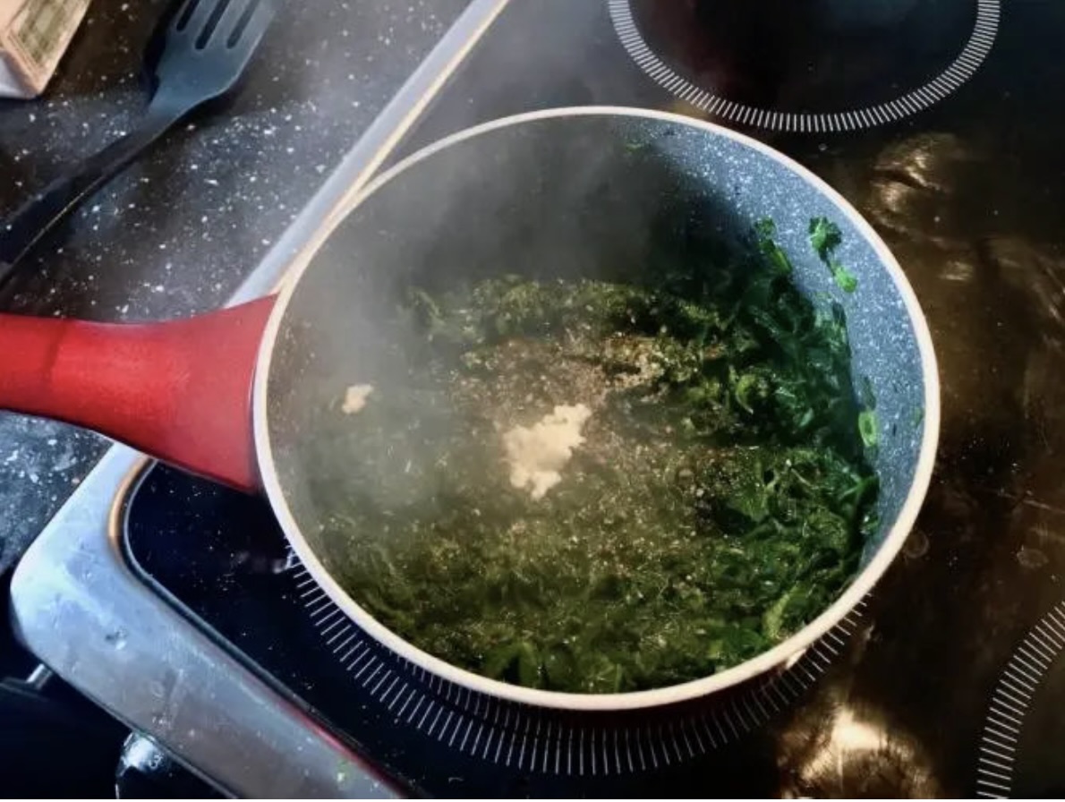 Szpinak i baza: Posiekaj dymkę i podsmaż ją krótko na maśle w rondelku. Dodaj szpinak i duś kilka minut, aż odparuje z niego woda. Pod koniec dodaj przeciśnięty czosnek, sól i pieprz. Odstaw do przestygnięcia.