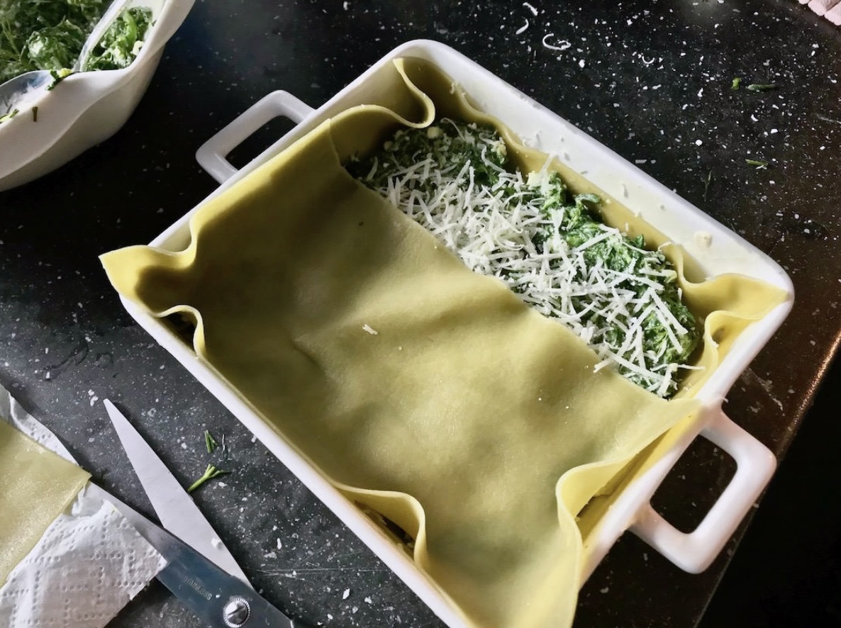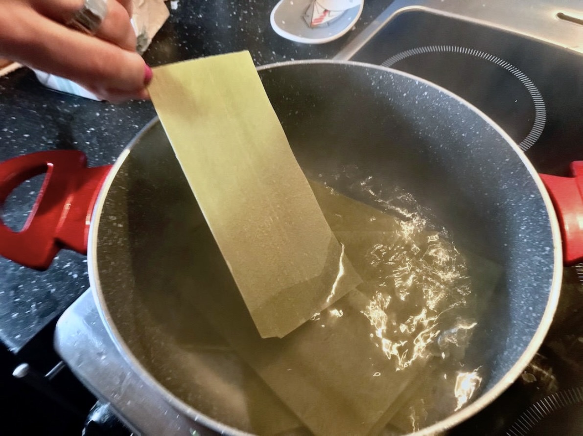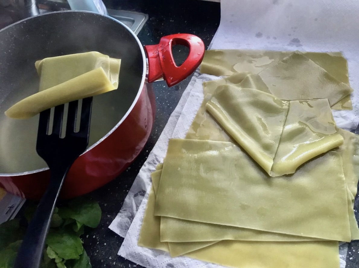 Makaron: Podgotuj płaty makaronu w osolonej wodzie przez około 7 minut (dzięki temu, że nie używamy beszamelu, makaron musi być wcześniej zmiękczony). Po ugotowaniu przelej go zimną wodą i osusz na ściereczce.