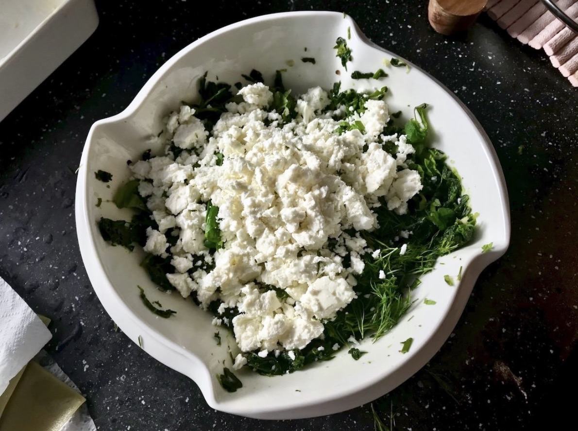 Farsz: Do przestudzonego szpinaku dodaj posiekany koperek, miętę i natkę pietruszki. Wkrusz fetę, wbij jajko i dopraw świeżo zmielonym pieprzem (z solą uważaj, bo sery są już słone). Całość wymieszaj.