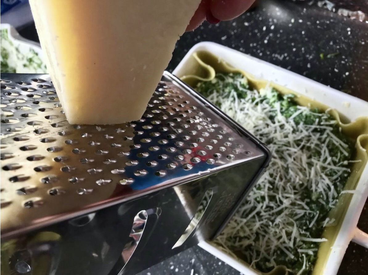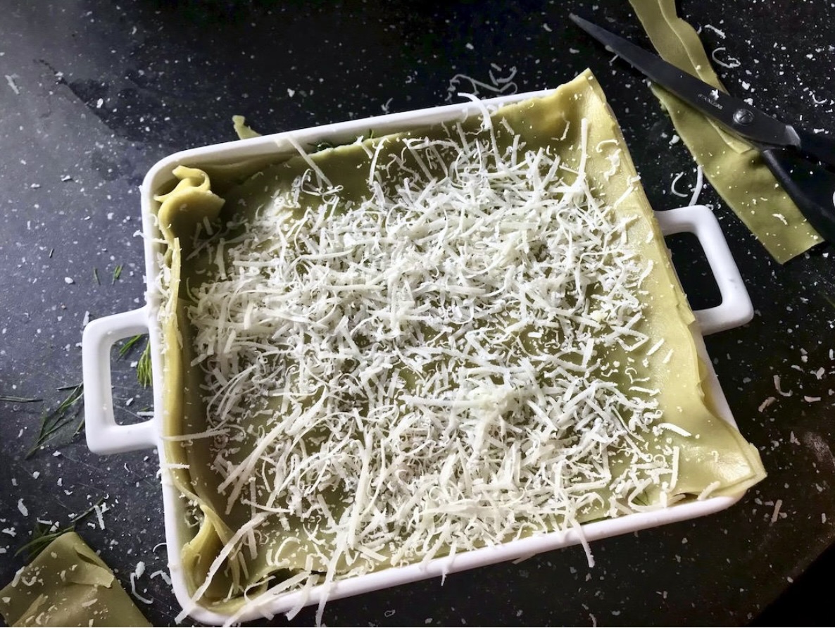 Ułóż warstwami: makaron → połowa farszu → starty parmezan → makaron → druga połowa farszu (zostaw 1 łyżkę na wierzch) → parmezan → ostatnia warstwa makaronu.