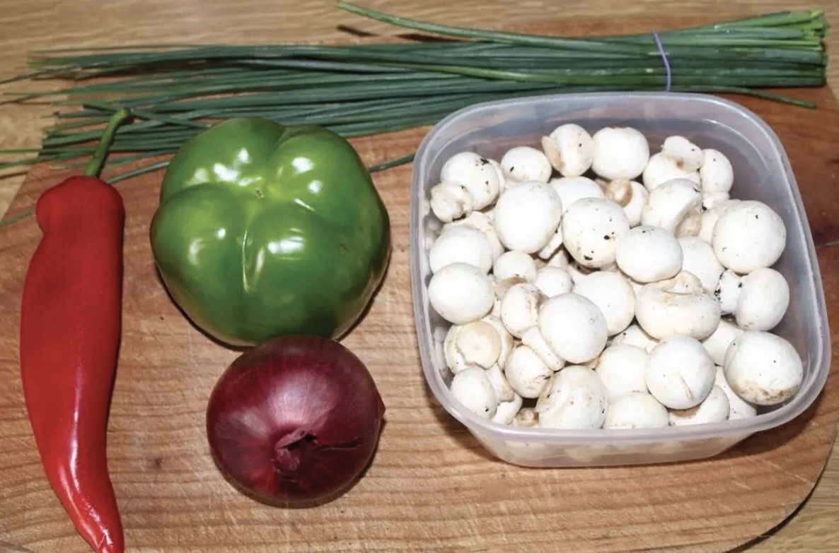 Warzywa: 400 g pieczarek (mniejsze w całości, większe przekrojone na pół), 2 duże cebule, 2 ząbki czosnku.