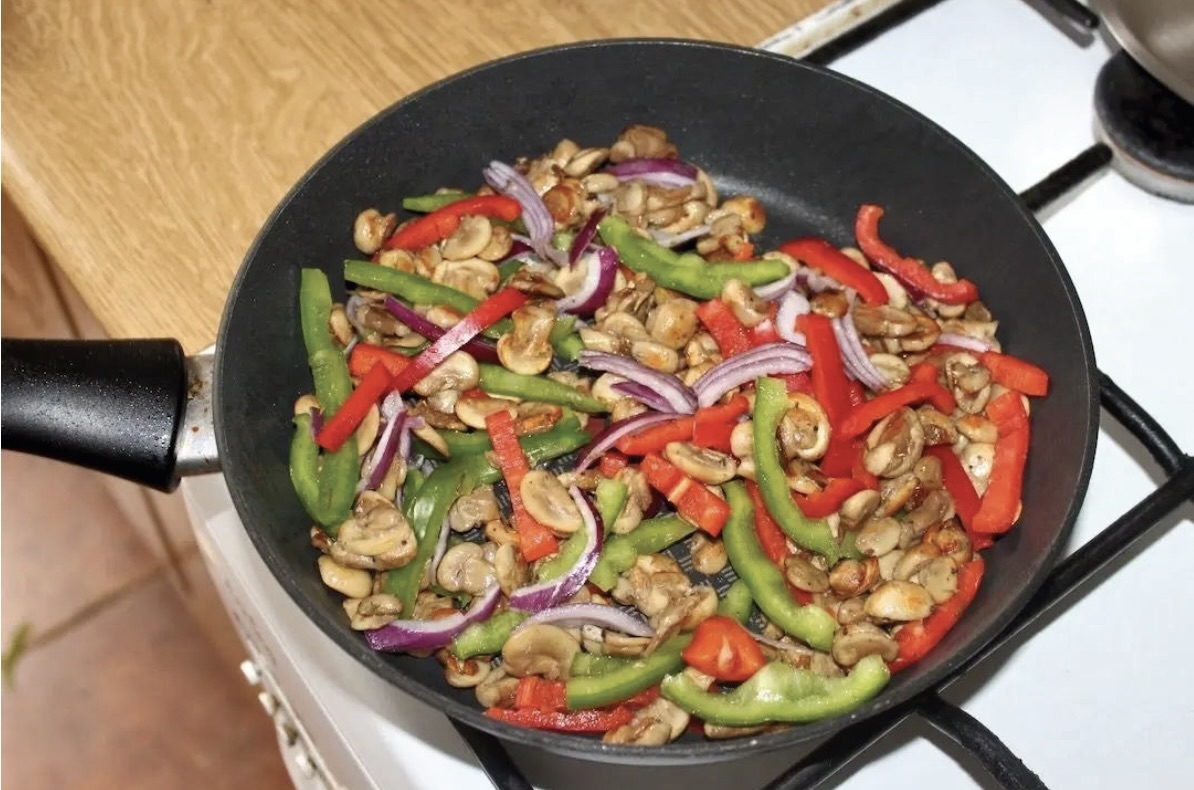 Baza warzywna: Na tym samym tłuszczu (dodaj łyżkę masła, jeśli trzeba) podsmaż cebulę pokrojoną w piórka. Gdy zmięknie, dodaj pieczarki i smaż, aż odparuje z nich woda i zaczną się rumienić. Pod koniec dodaj posiekany czosnek.