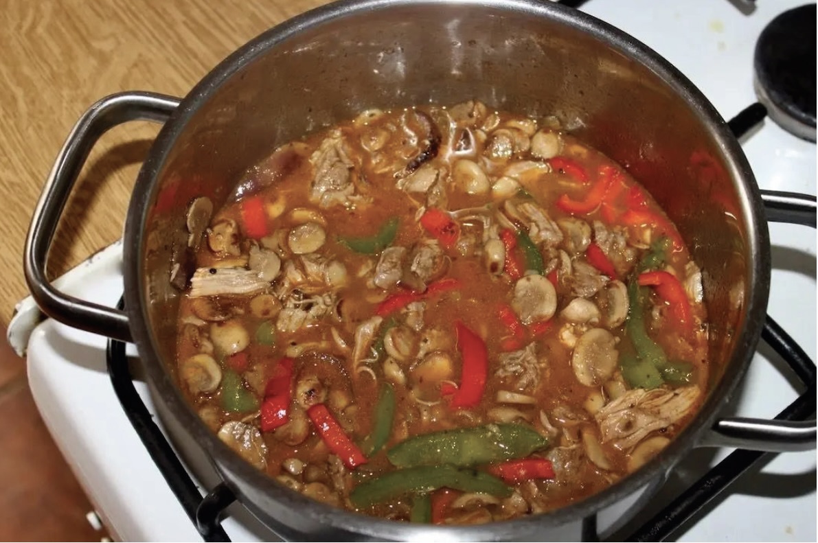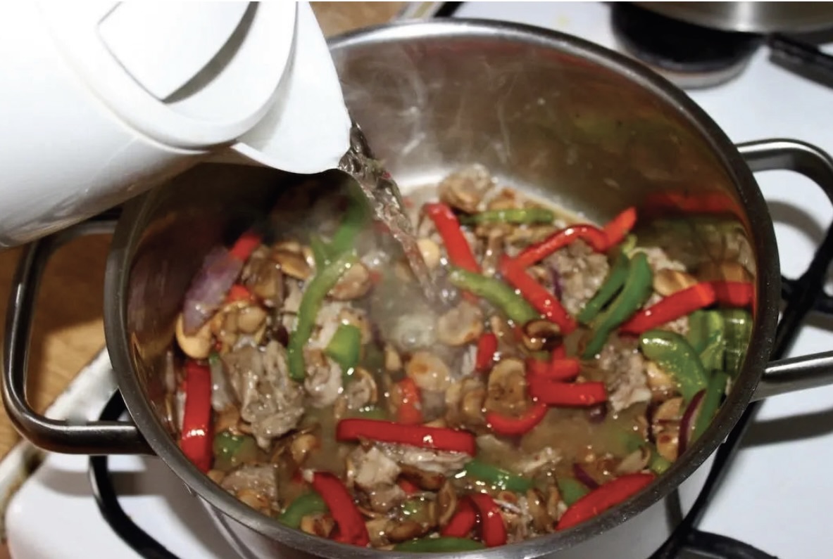 Gotowanie: Dodaj bulion, liście laurowe, ziele angielskie i słodką paprykę. Przykryj garnek i duś na bardzo małym ogniu przez około 1,5 do 2 godzin (mięso musi być całkowicie miękkie i rozpadać się pod widelcem).
