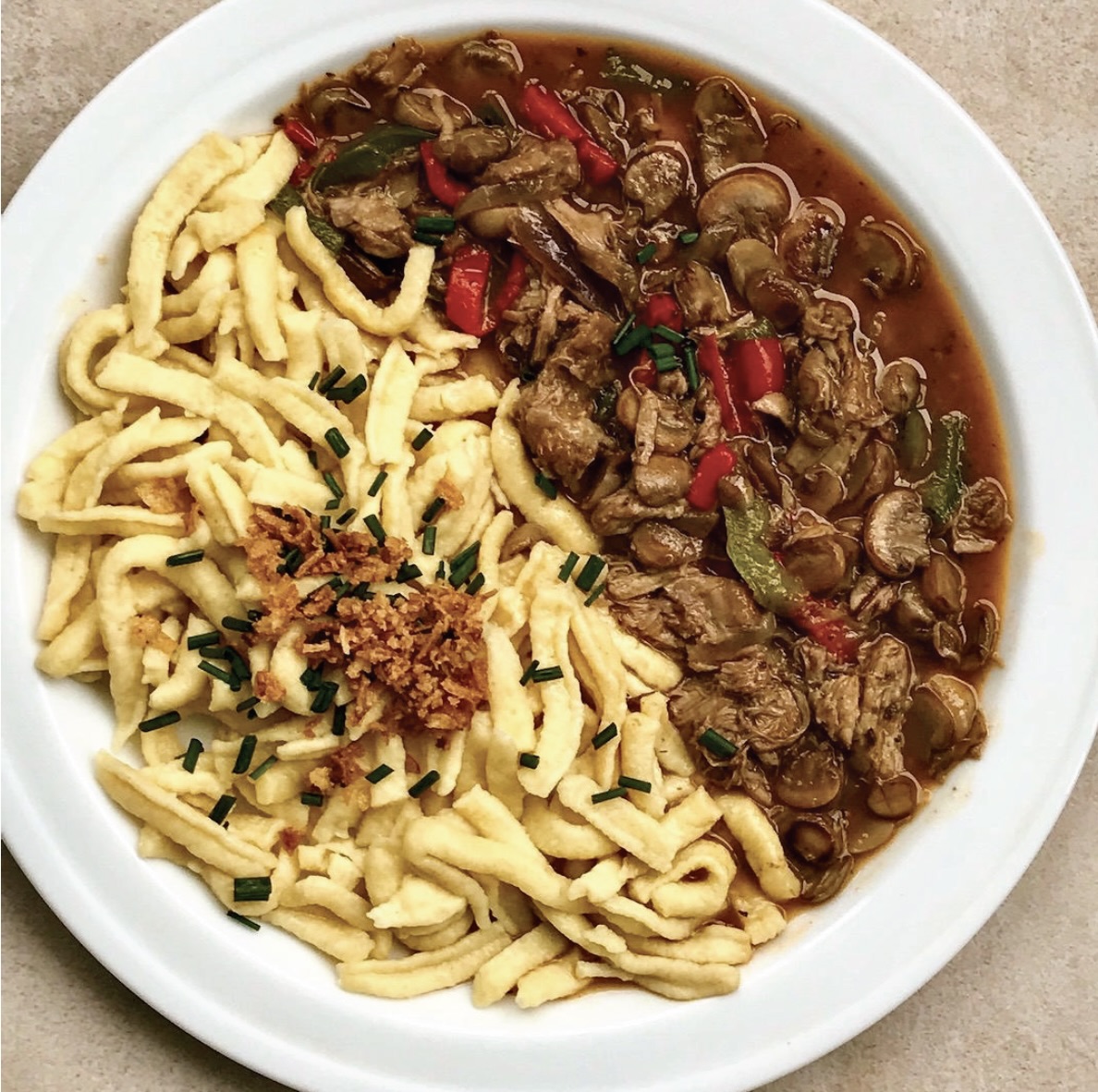 Podanie: Nałóż porcję gorących szpecli, polej gulaszem z dużą ilością sosu i pieczarek. Całość możesz posypać posiekaną natką pietruszki. Smacznego!
