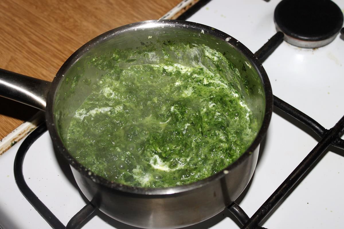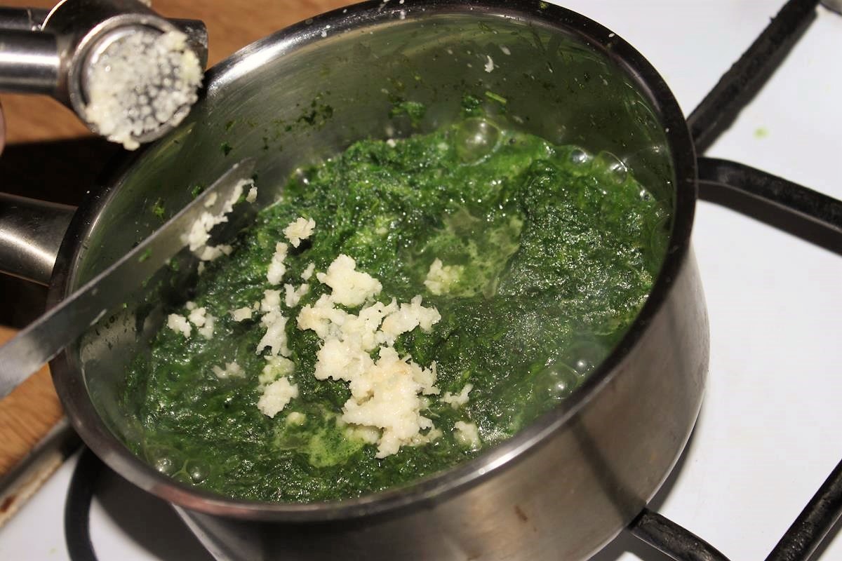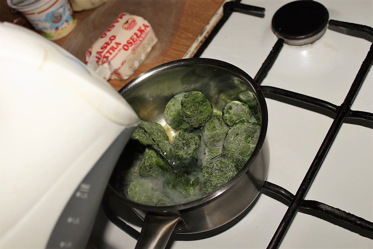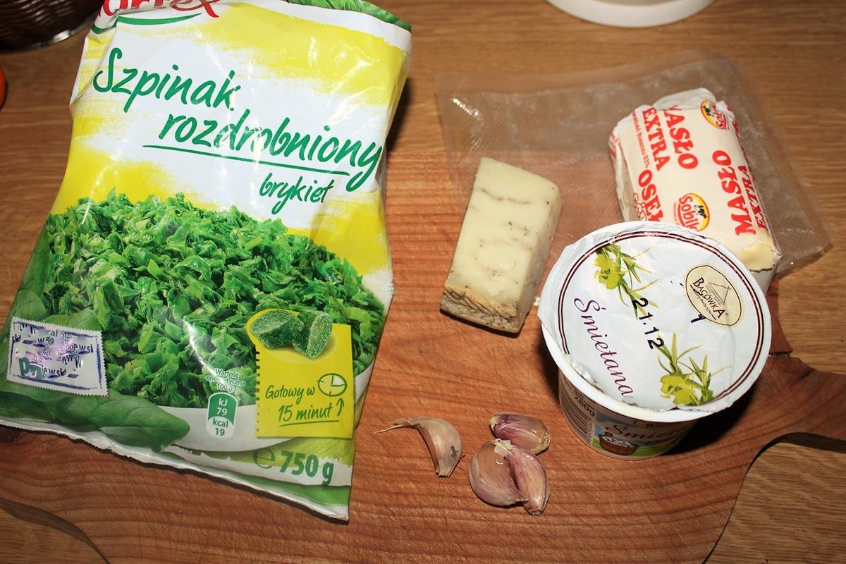 Szpinak i sos: Dodaj umyty szpinak i poczekaj, aż „zwiędnie” (zmniejszy objętość). Następnie wlej śmietankę. Całość dopraw gałką muszkatołową, solą oraz świeżo mielonym pieprzem. Gotuj na małym ogniu przez 2–3 minuty, aż sos lekko zgęstnieje.