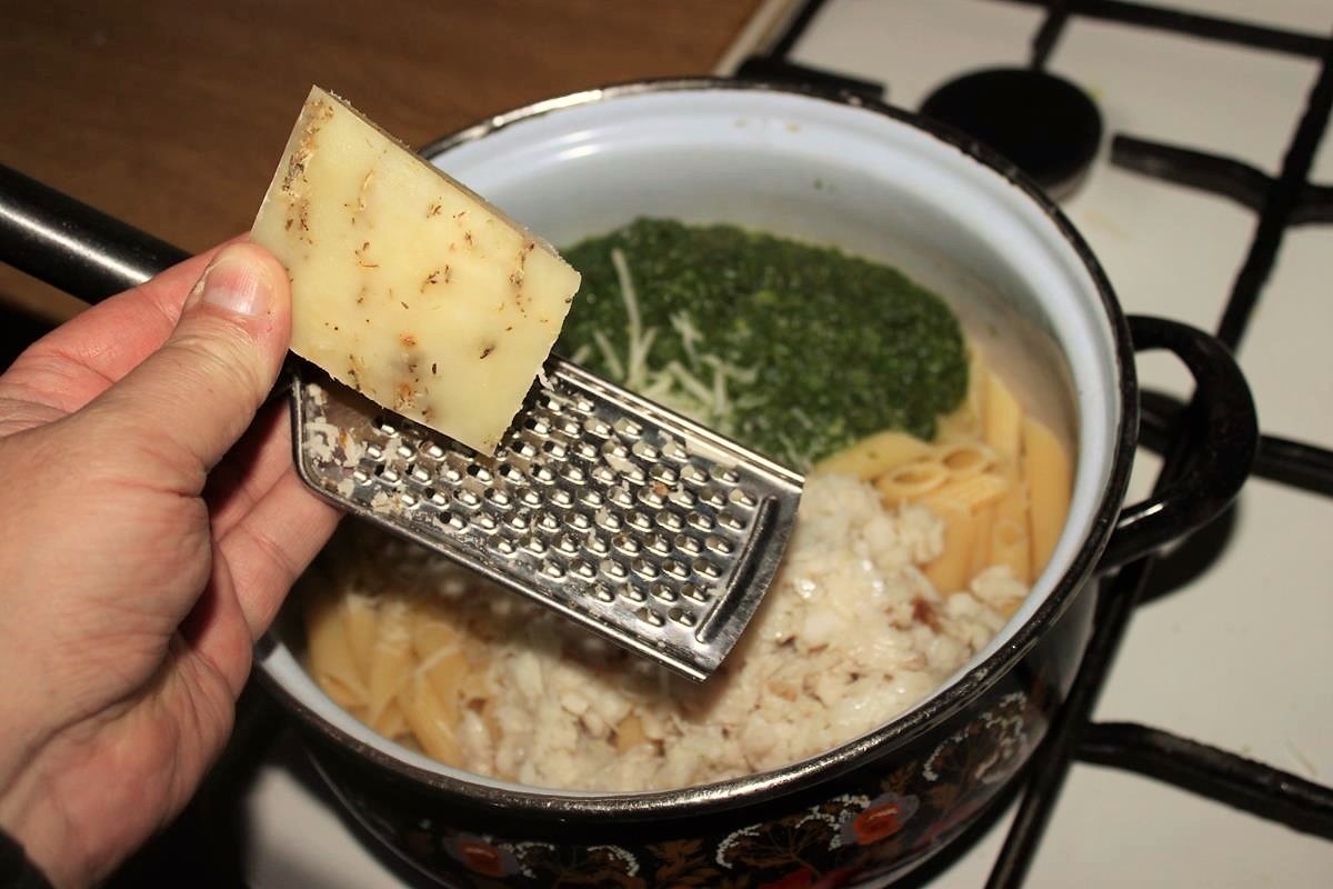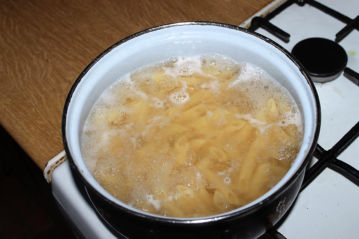 Gotowanie makaronu: Makaron ugotuj w osolonej wodzie al dente (zgodnie z instrukcją na opakowaniu). Odcedź, zostawiając około pół szklanki wody z gotowania.