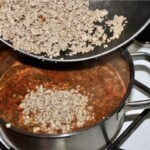 Mięso: Zmielone mięso podsmaż na oliwie na dużej patelni przez około 10 minut.