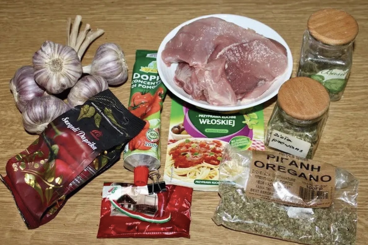 Przyprawy: 5 łyżeczek suszonego oregano, 5 łyżeczek suszonych ziół prowansalskich, 3 łyżeczki suszonej bazylii, 1 łyżeczka słodkiej mielonej papryki, ostra mielona papryka (do smaku), sól, pieprz, pół opakowania przyprawy do kuchni włoskiej.