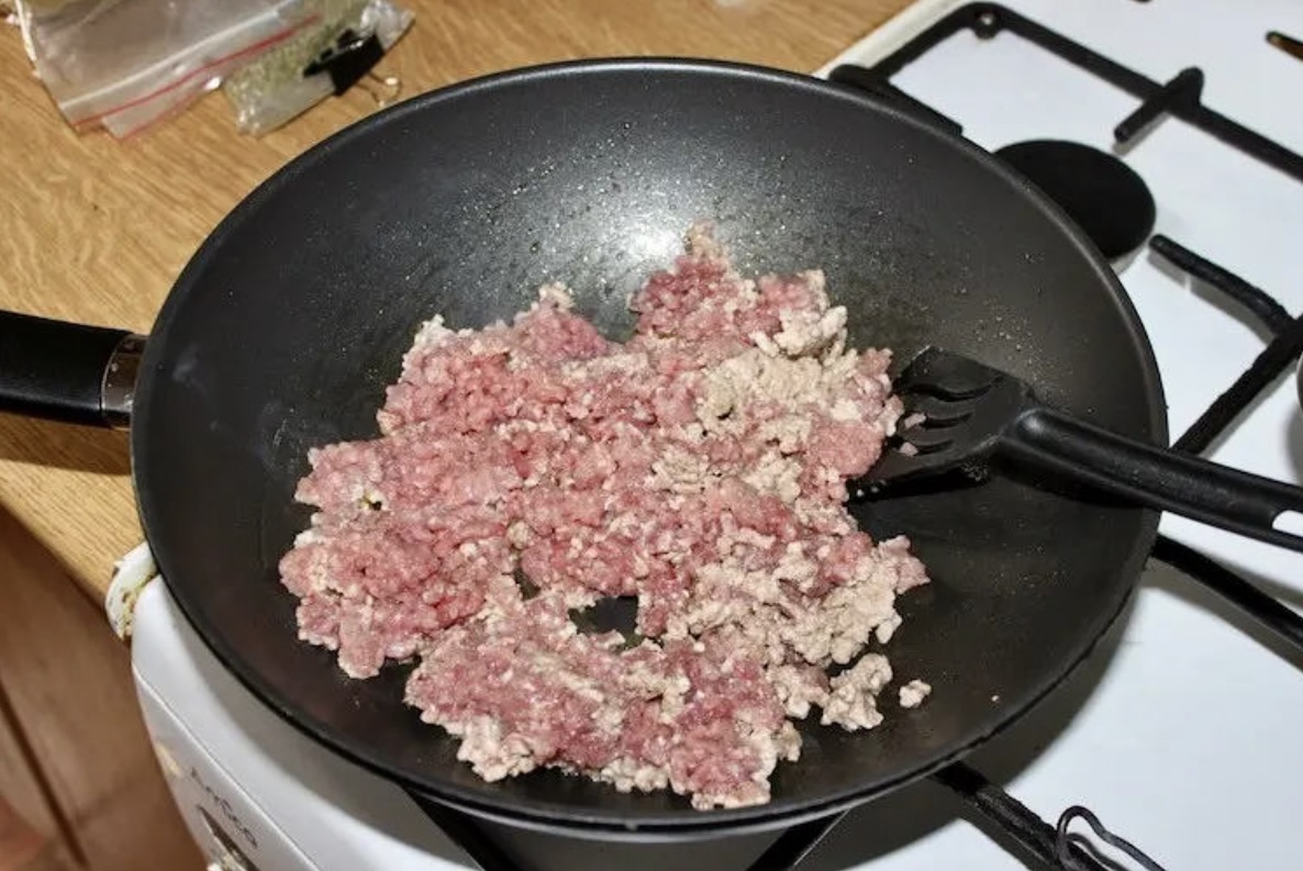 Mięso: Zmielone mięso podsmaż na oliwie na dużej patelni przez około 10 minut.