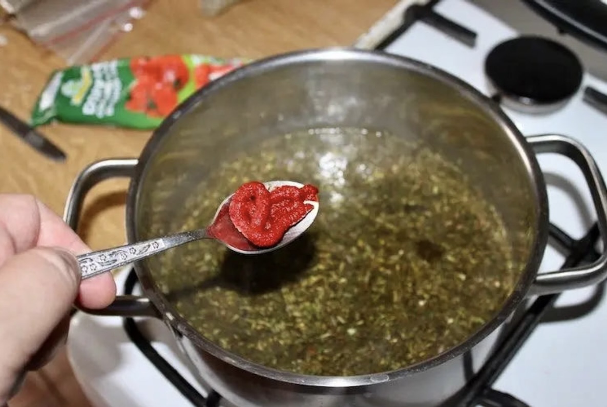 Sos: W garnku zagotuj około pół litra gorącej wody. Dodaj wszystkie suszone zioła (oregano, bazylia, zioła prowansalskie), koncentrat pomidorowy, przeciśnięty czosnek, słodką i ostrą paprykę, sól, pieprz oraz pół opakowania przyprawy do kuchni włoskiej. Wymieszaj.