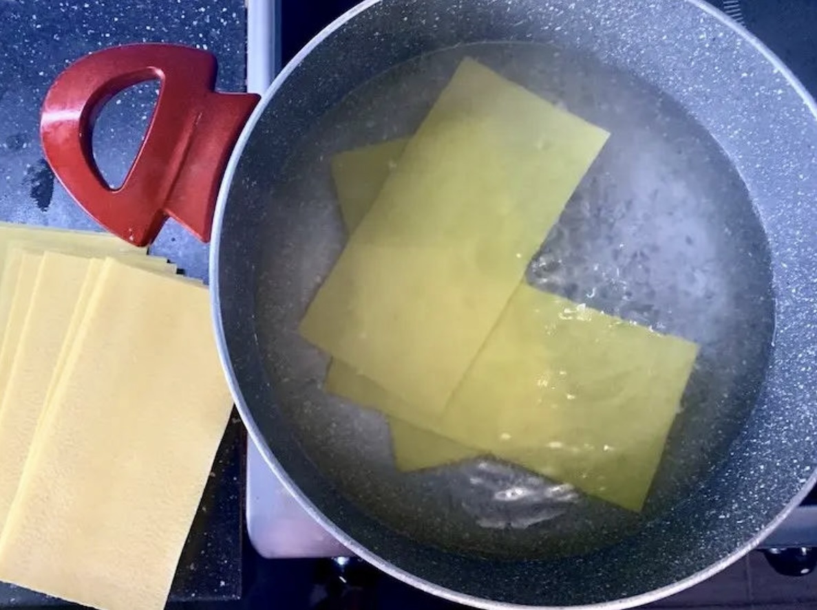 Makaron: Ugotuj płaty makaronu lasagne we wrzącej, osolonej wodzie przez około 7 minut, pilnując, aby się nie skleiły. Odcedź i szybko przelej zimną wodą. Odsącz na ściereczce.