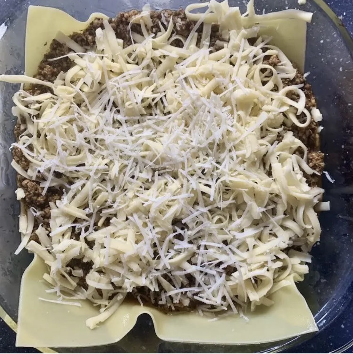 Na makaron nałóż połowę sosu z mięsem, a następnie mniej niż połowę startych serów.