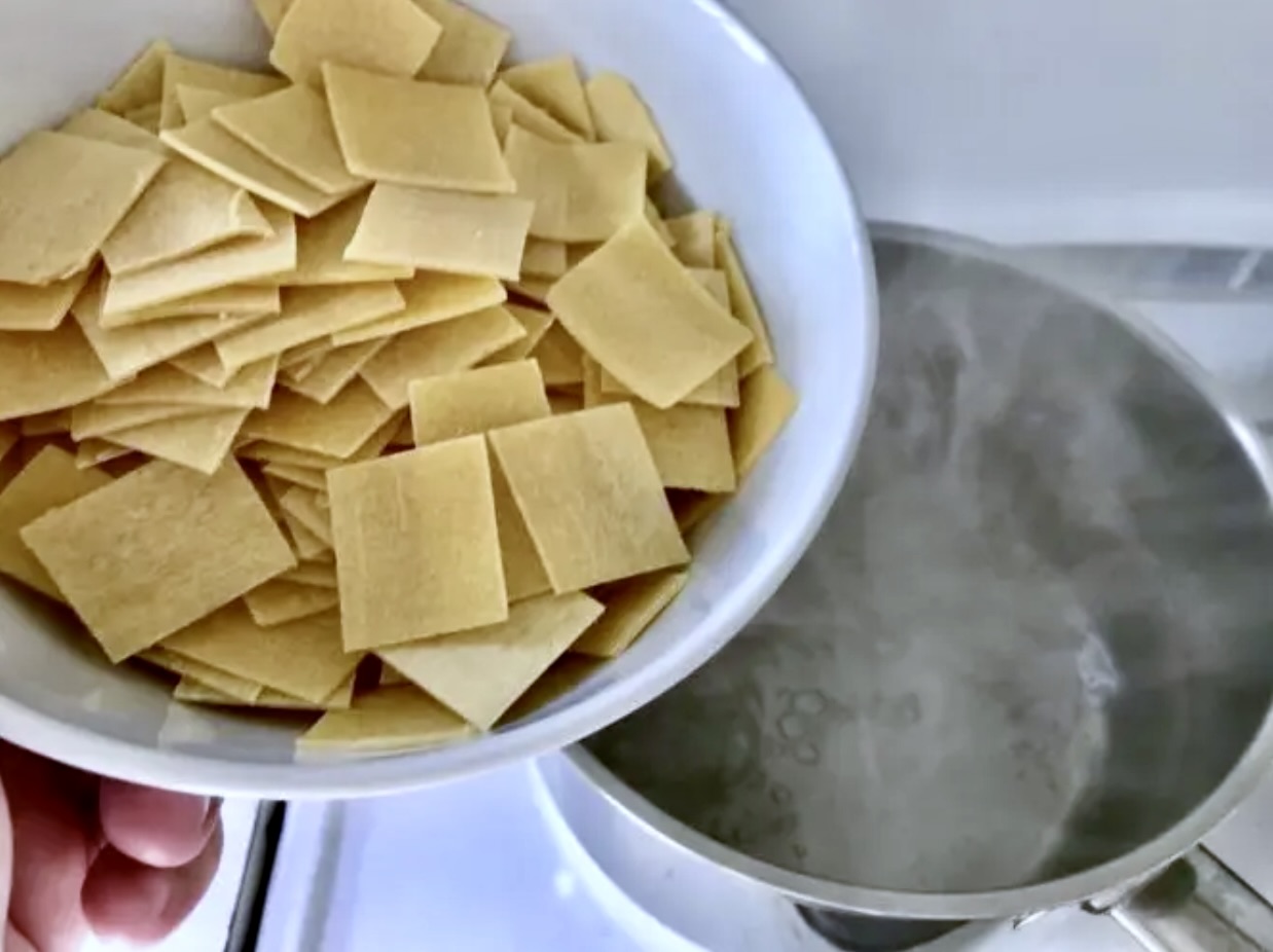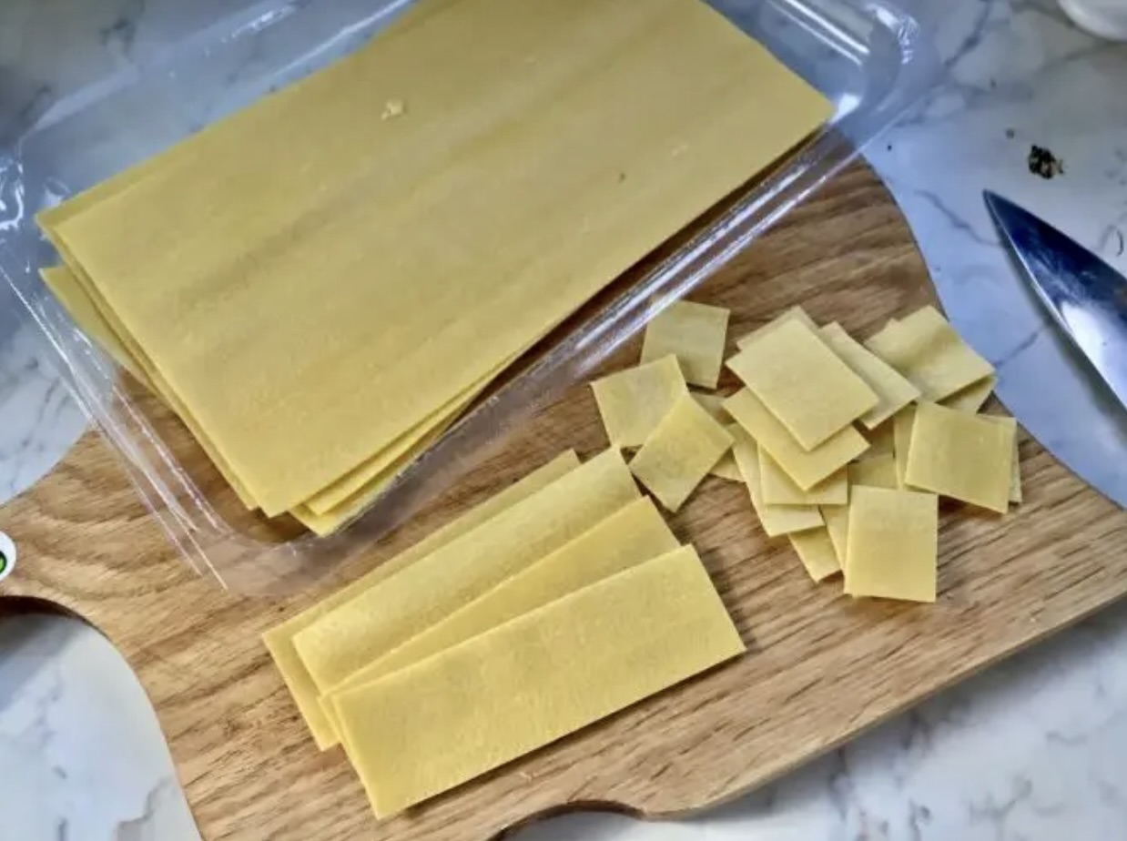 Makaron: Świeże płaty makaronu lasagne pokrój w kostkę, tak aby przypominała kształtem suchy makaron łazanki. Następnie wrzuć makaron na osoloną gotującą się wodę. Gotuj makaron kilka minut, aby był „al dente”. Odcedź go.