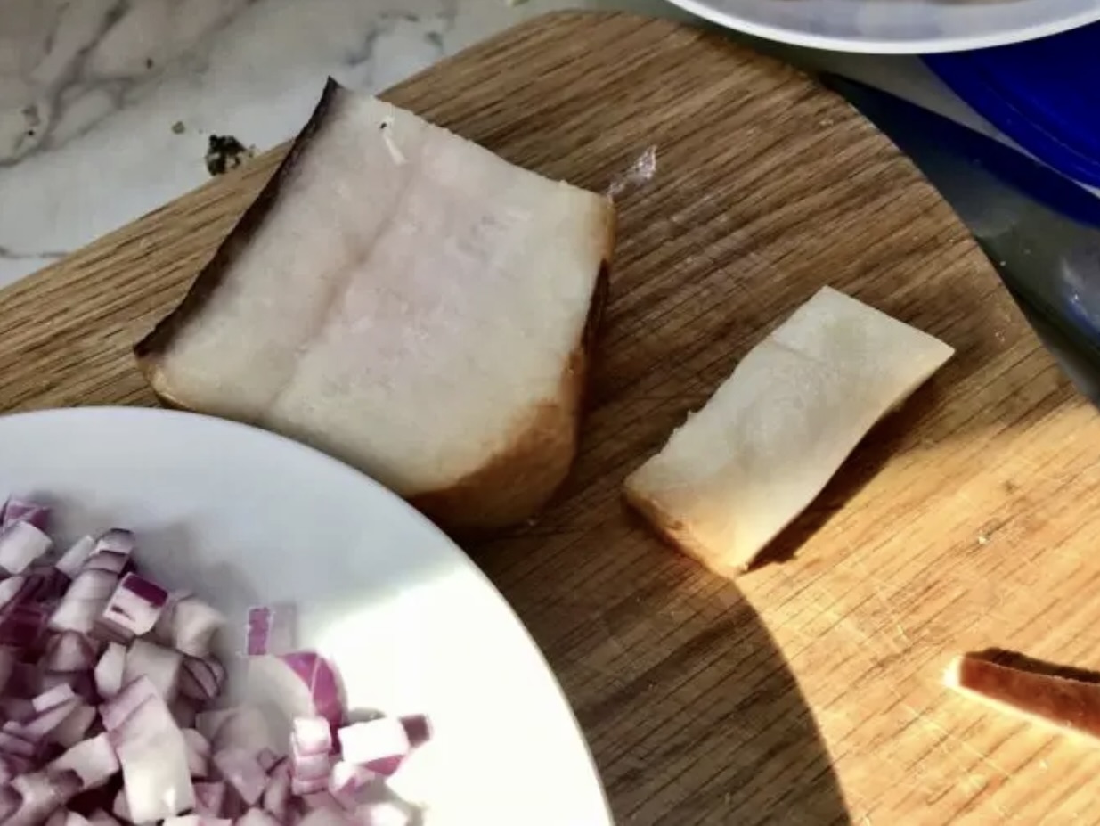 Słonina i cebula: Mały kawałek wędzonej słoniny pokrój w drobną kostkę. Cebulę również pokrój w drobną kosteczkę.