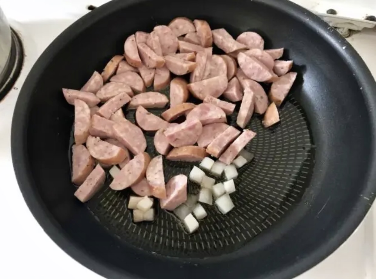 Cebula: Do kiełbasy dodaj pokrojoną cebulę i smaż chwilę, aż się zeszkli.