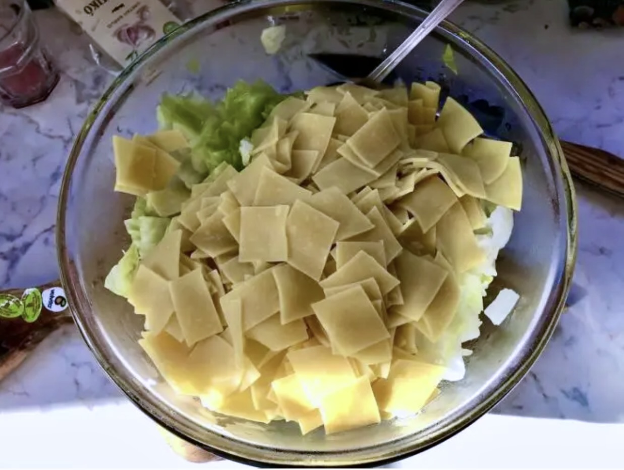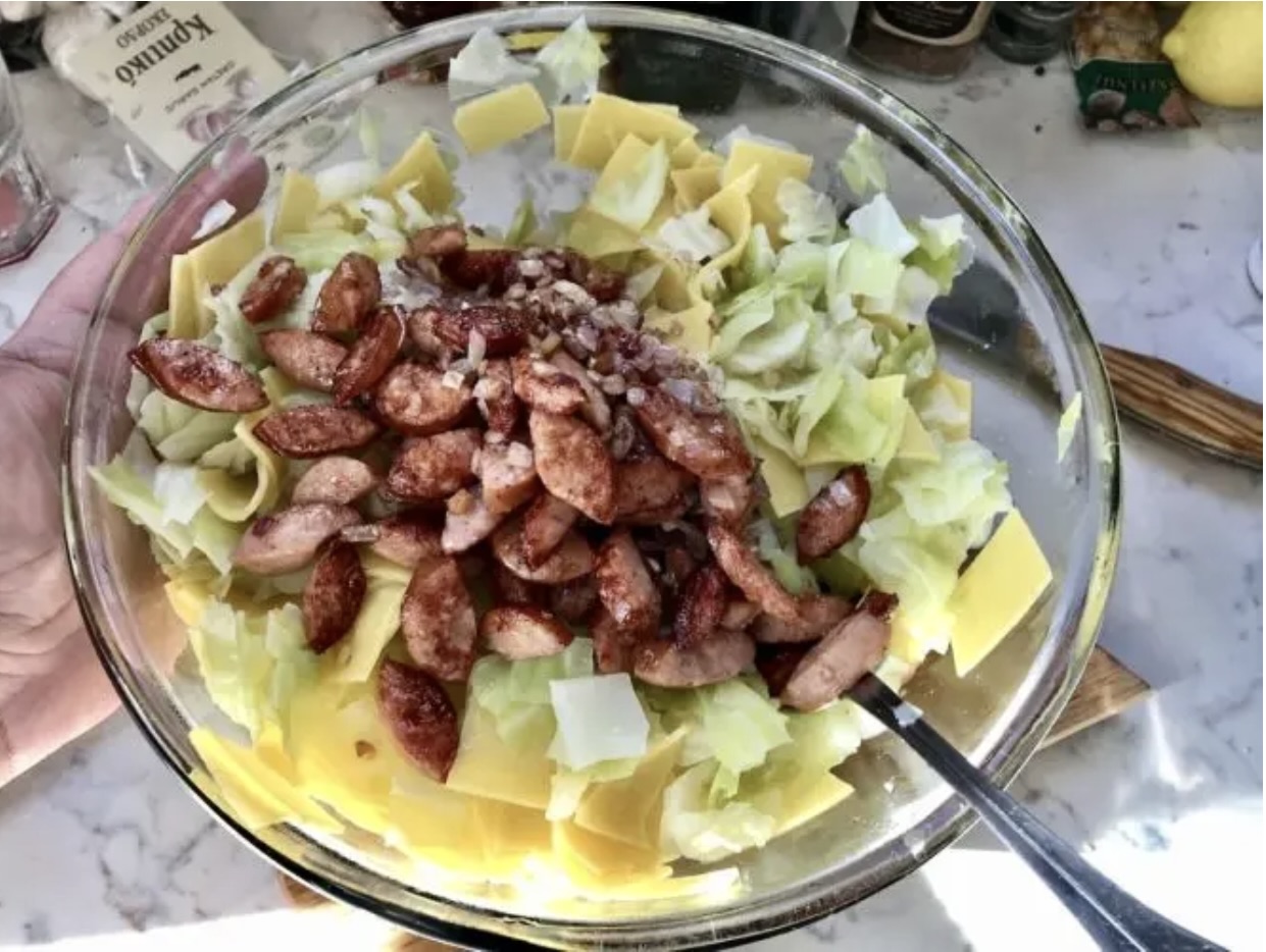 Łączenie: Przełóż odcedzoną kapustę do dużej miski. Dodaj do niej ugotowany i odcedzony makaron. Dodaj przesmażoną kiełbasę z cebulą i słoniną.