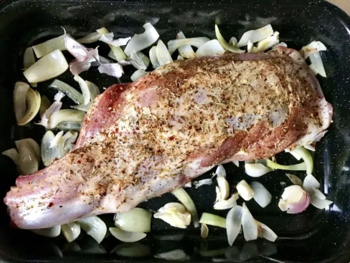 Pieczenie (etap 1): Przełóż cebulę i czosnek do brytfanny. Na warzywach ułóż łopatkę. Wlej szklankę gorącej wody. Całość przykryj szczelnie folią aluminiową.