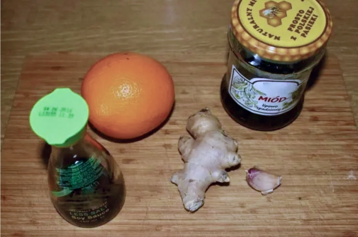 Marynowanie: W misce wymieszaj sok z pomarańczy, sos sojowy, miód, starty imbir oraz zmiażdżony ząbek czosnku. Włóż łososia do marynaty (skórą do góry), tak aby był nią przykryty. Odstaw do lodówki pod przykryciem na 1 godzinę.