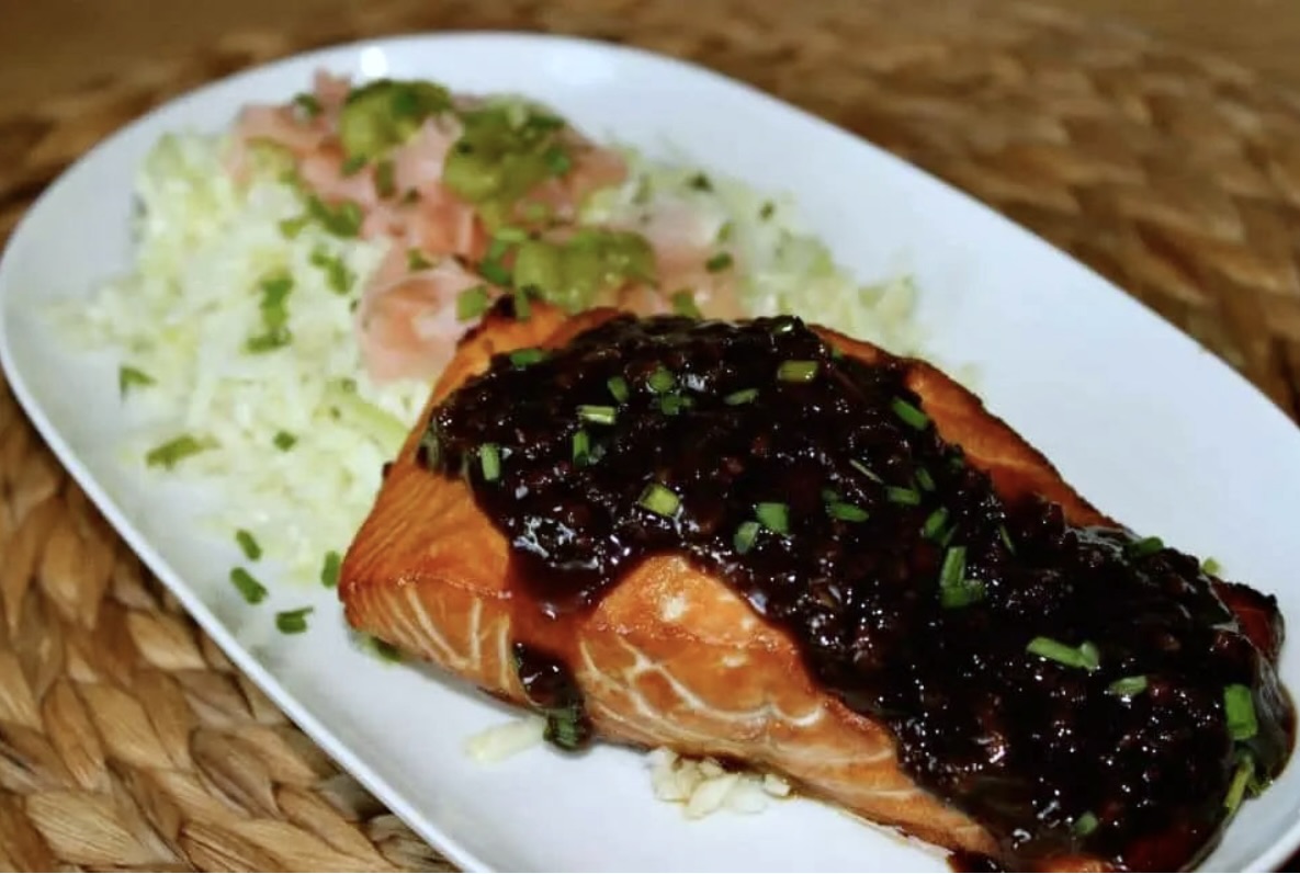 Podanie: Upieczonego łososia połóż na talerzu, polej przygotowanym sosem i posyp dymką. Serwuj z marynowanym imbirem, wasabi i surówką z pora.