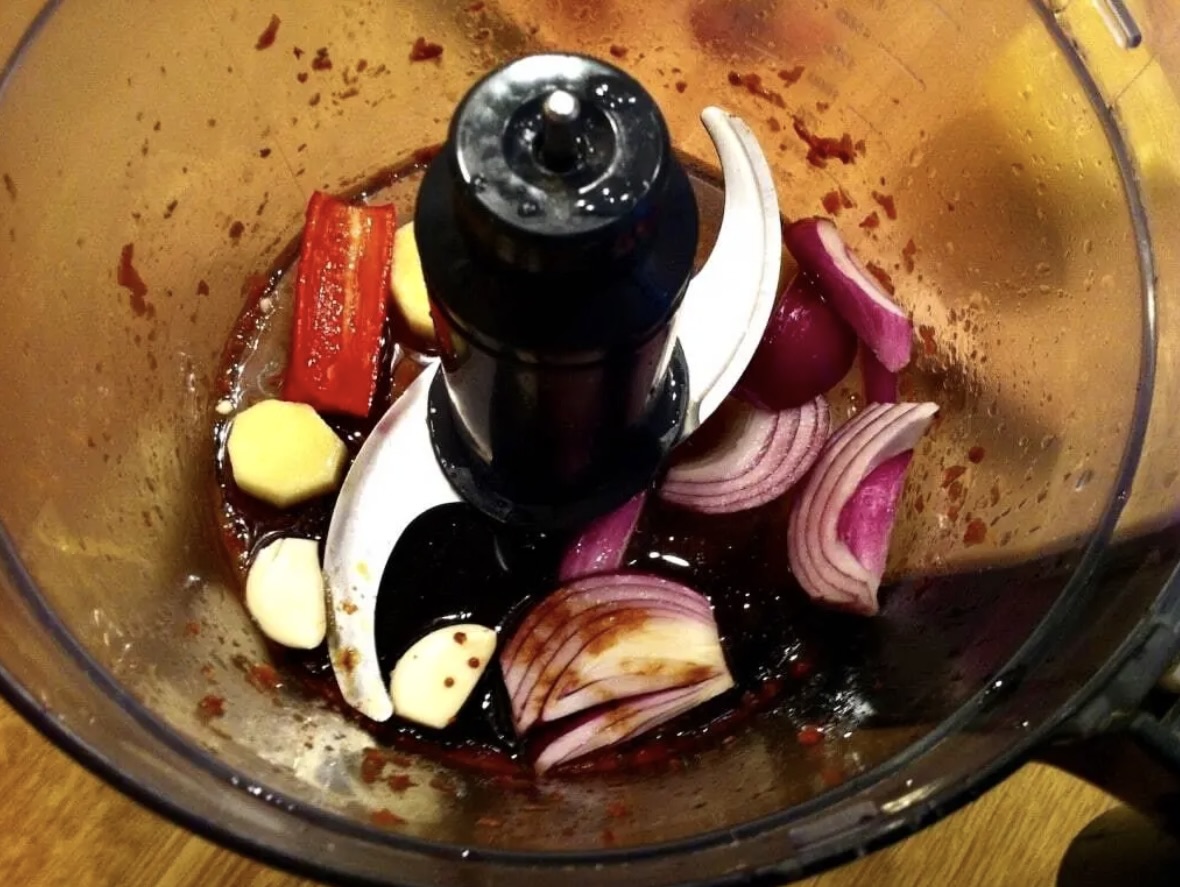 Przygotowanie sosu: Do malaksera wrzuć czerwoną cebulę, pół papryczki chili, mały kawałek świeżego imbiru, 2 ząbki czosnku, wlej 3 łyżki sosu sojowego oraz trochę soku z cytryny. Zmiksuj składniki, a następnie dodaj 1 łyżeczkę przyprawy „chińskie 5 smaków”, a następnie ponownie zmiksuj. Sos może być gładki lub częściowo pozostawiony w drobnych kawałkach.