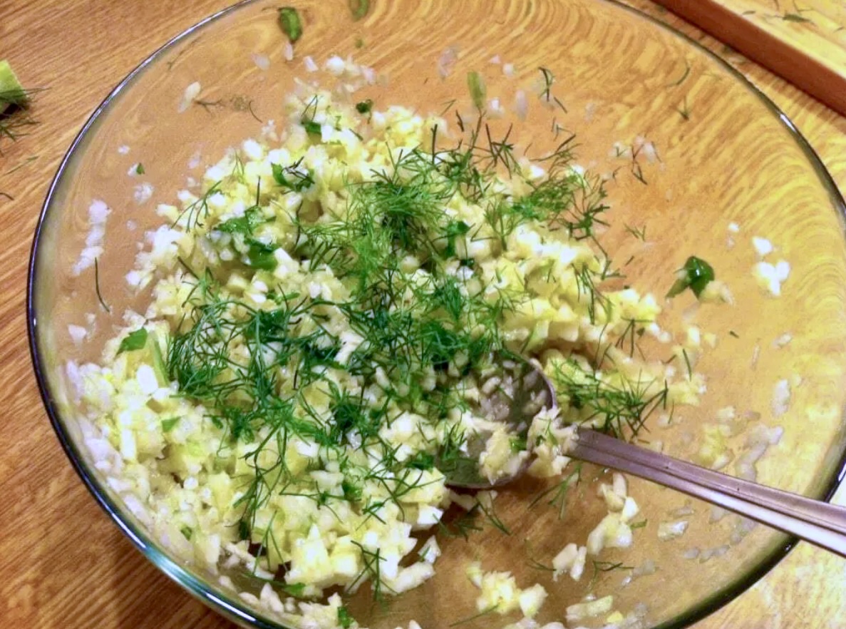 Dressing do sałatki: Zmiksowany koper przełóż do miski. Dodaj 2 łyżki oliwy, posiekane listki kopru włoskiego, łyżeczkę mielonego kminu rzymskiego i trochę soku z cytryny do smaku. Posól, zamieszaj i odstaw na bok.
