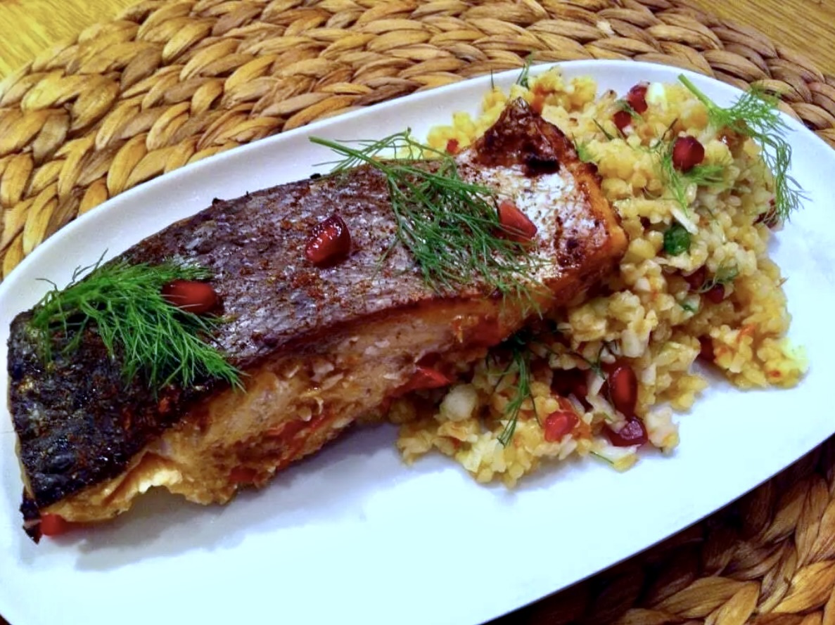 Łosoś pieczony z efektowną sałatką to danie dla amatorów smaków raczej zdecydowanych. Łosoś pieczony jest w przyprawach azjatyckich, a sałatka podana do niego zawiera m.in. bulgur i fenkuł. Myślę, że warto spróbować, zachęcam. Sałatkę można podać albo na gorąco, albo w temperaturze pokojowej, smakuje tak samo dobrze. Surowy koper włoski w tej sałatce jest rewelacyjny; jeżeli nie znasz jego smaku ta sałatka jest najlepszym daniem do jego wypróbowania, ponieważ koper jedynie delikatnie uzupełnia jej smak, a nie dominuje w niej.
